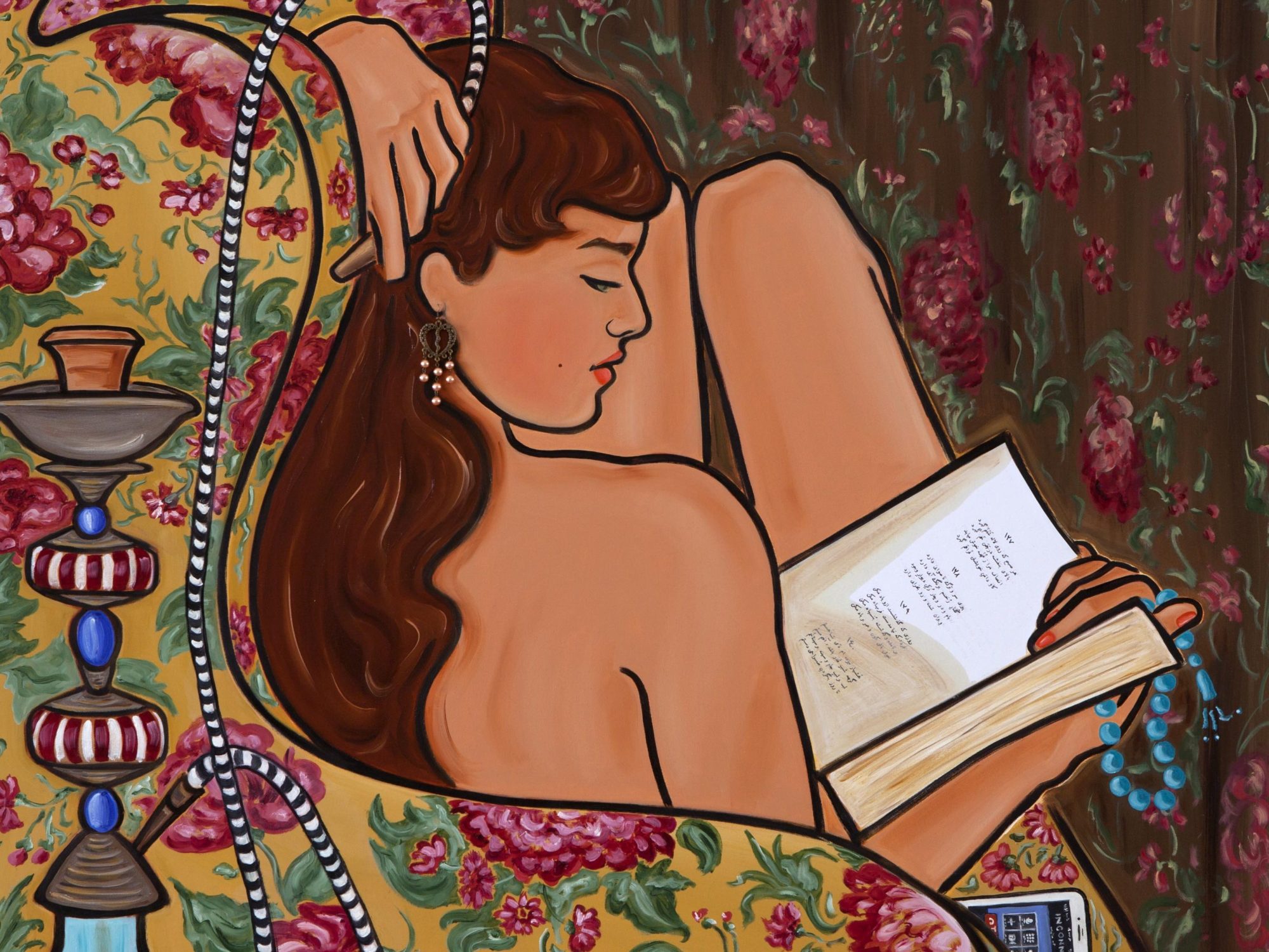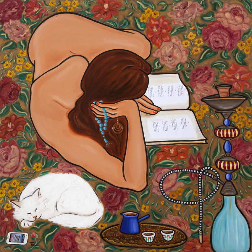 Mona, who lives and works in Beirut, graduated from the American University of Beirut just as the civil war was breaking out in Lebanon. She creates realistic paintings that depict women working in the fields, at construction sites and also dreamier, erotic images that feature them reading or resting in opulent surroundings – with hookahs and smartphones nearby. These pieces are odalisque-like but they remain specially significant because they are made by a female Middle Eastern artist herself to assert her individuality and not by a male Westerner, as in the past. “Jean-Auguste-Dominique Ingres and Henri Matisse were dreaming about such a world of women,” says Mona, “although they didn’t have the chance to see it or get into it. I intend to paint a real women’s world from the inside of her everyday life, creating a complexity that no Orientalist can ever dream of.”