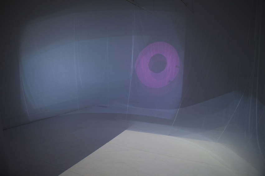 Nayeon writes: “It is an interactive multichannel live-feed video installation. 2 projections on the white floor and 4 layers of curved sheer fabric screens occupy the exhibition space. The sheer fabric screens divide the space into inner and outer spaces, where an audience may have different visual experiences. Projection images are created within the space and show physicality of the space itself captured from the live-feed video cameras. When there is no audience, the projections are virtually empty.