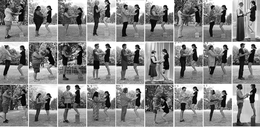 “Are we even now?” I keep checking at the mirror, stepping on bricks, bending my knees, or sometimes tiptoeing for forty-five seconds to make our height even and straight eye contact. At the end of the performance, I take a picture of our performing bodies. Each picture is sent to the participant to remind her or him of a memory of a standard woman in a different view of the event: The memory of how she was made for 45 seconds, beside memory of making straight eye contact and holding hands for 45 seconds.”