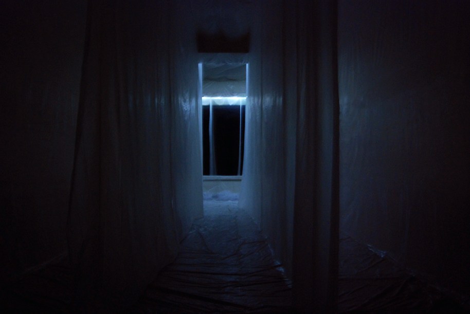 Interactive installation: mirror, darkness and light, plastic, a moving body(s). Dimensions variable.