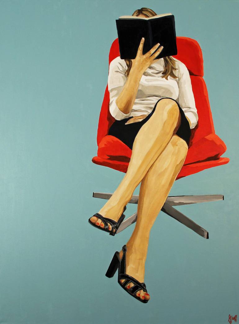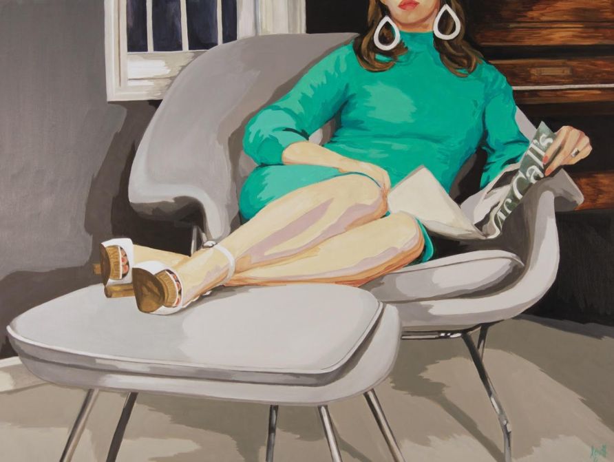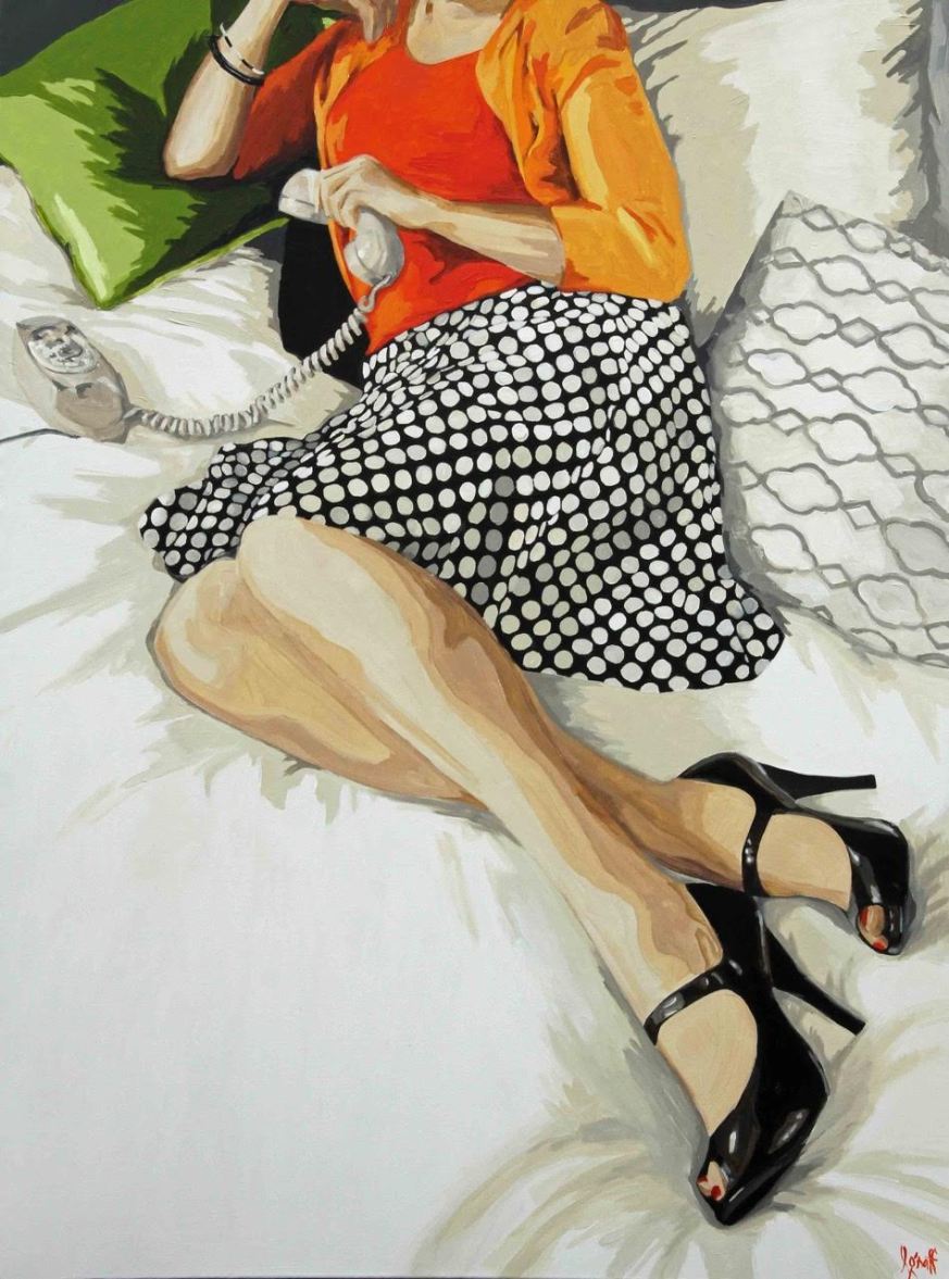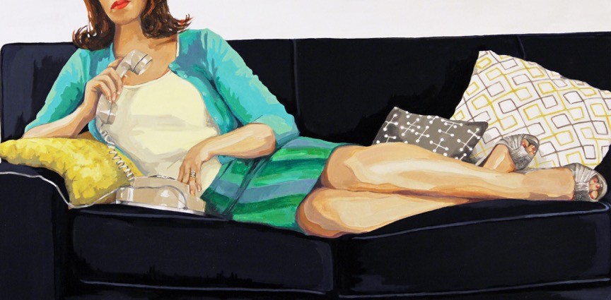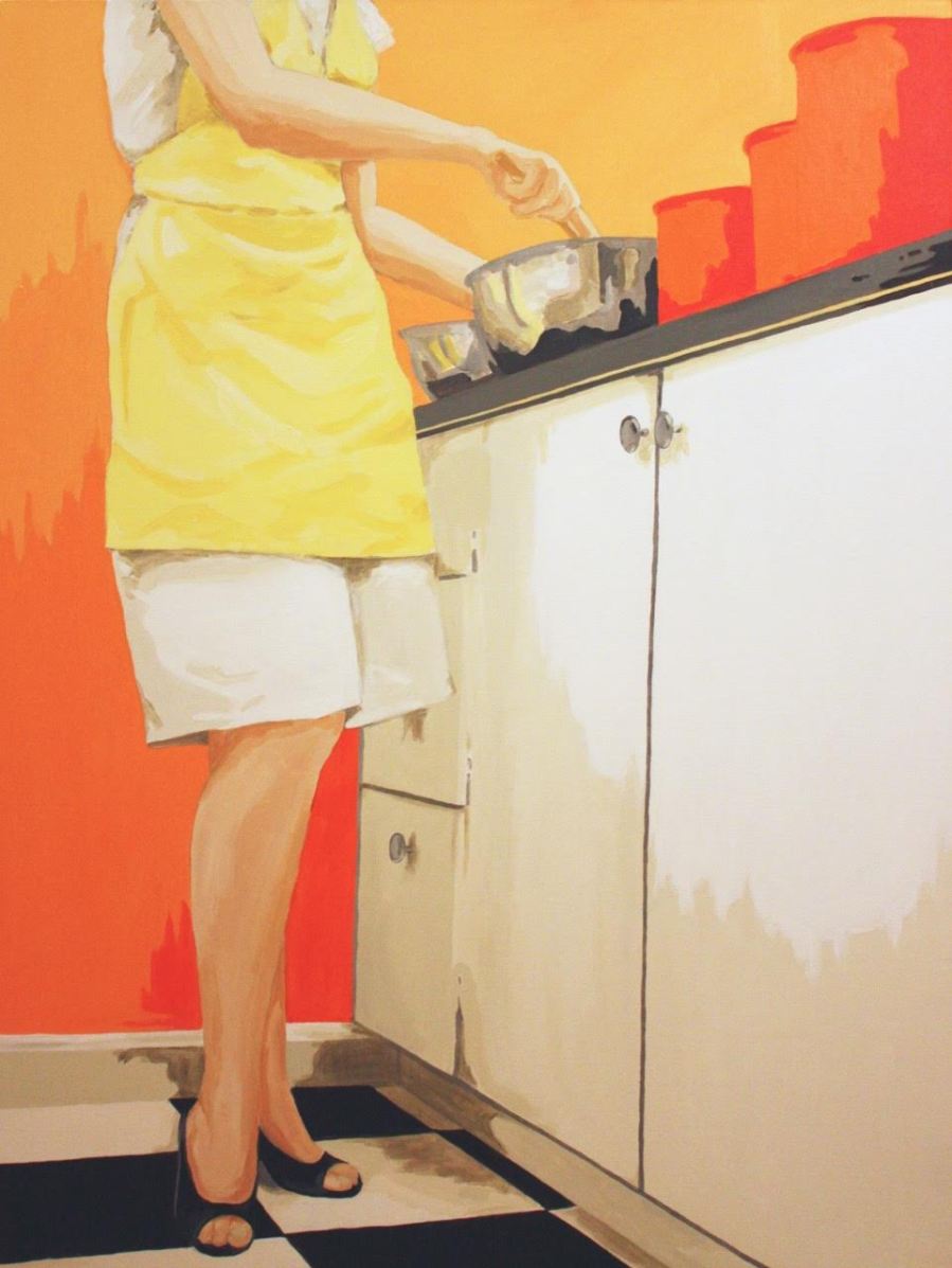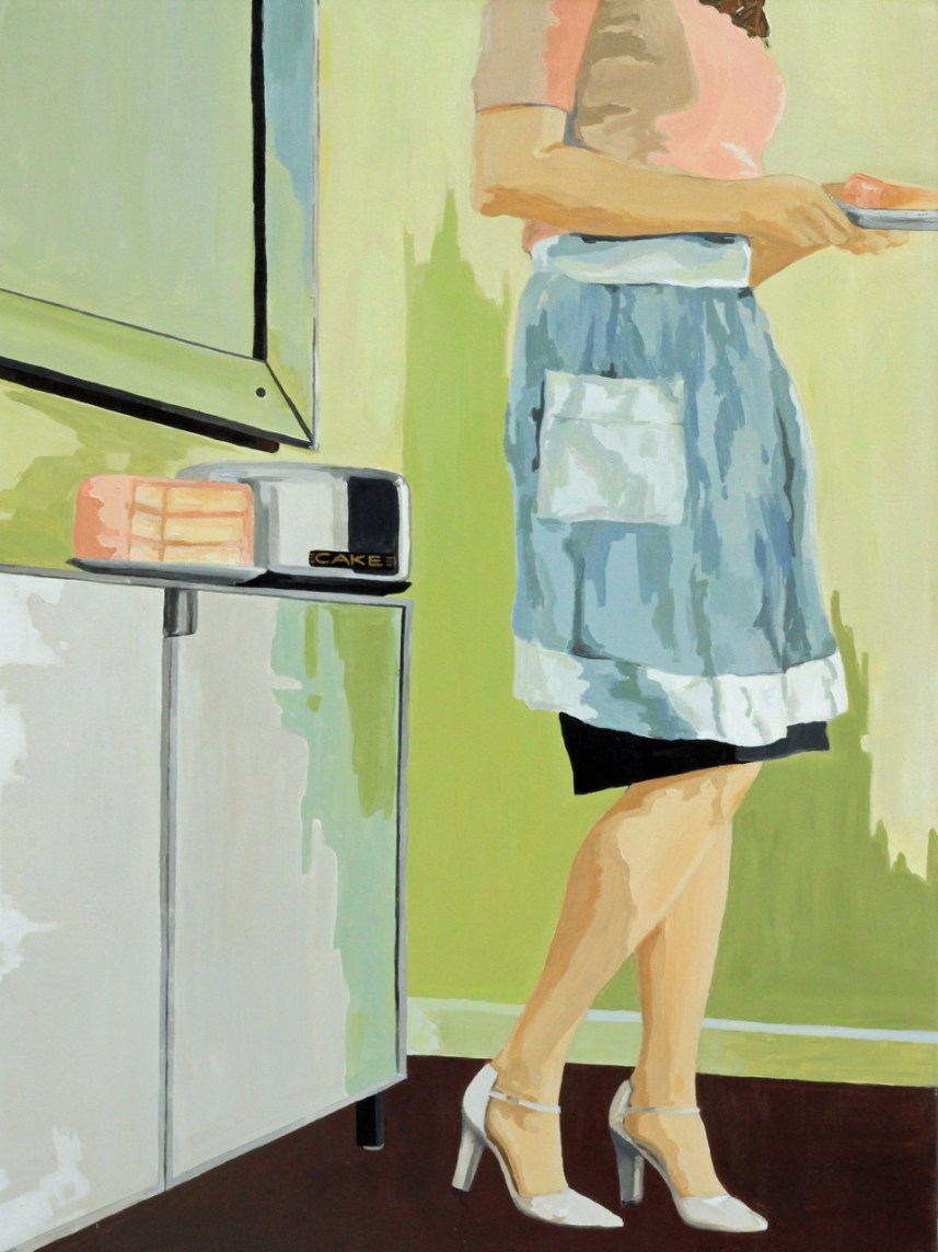 In her “Domestic Series”, artist Leslie Graff explores personal identity and experiences of daily life. The characters are young women, neatly dressed in skirts and blouses, baking, reading, taking care of kids, attending a phone call. When you look at these paintings, you get a nostalgic 1950s effect, but the females aren’t really imprisoned as dutiful housewives. Many are pretty independent, moving in and out of doors, up and down the staircase, with bags, briefcases. But yes, the artist always excludes the faces – which seems to imply that in this period of history, women didn’t have much of an individual identity of their own, even though many of them might have been comfortable and well-off.