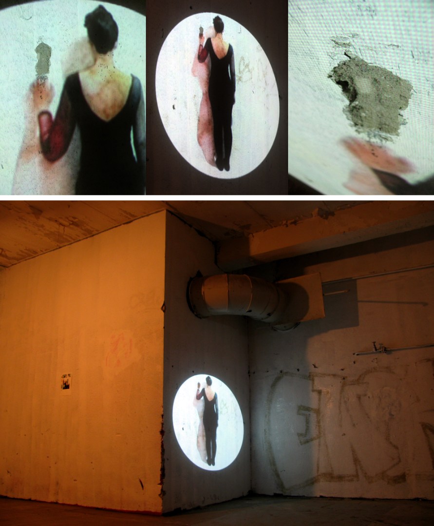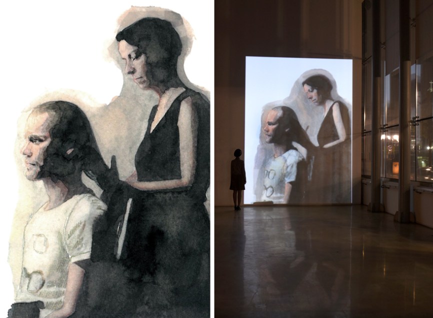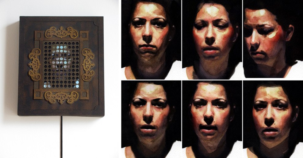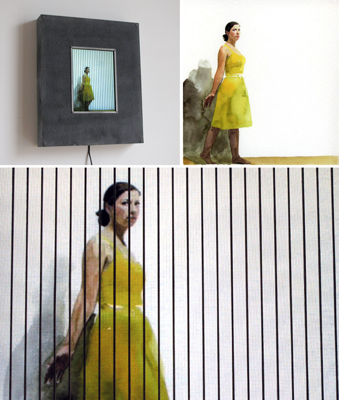Combining watercolour techniques with animation and physical objects, Hungarian artist Klára Petra Szabó creates site-specific installations that show personalities in moments of introspection. A cupboard opens to a couple, a window to a walking girl, a keyhole to a woman in a kitchen, a confessional grill to a disturbed face.