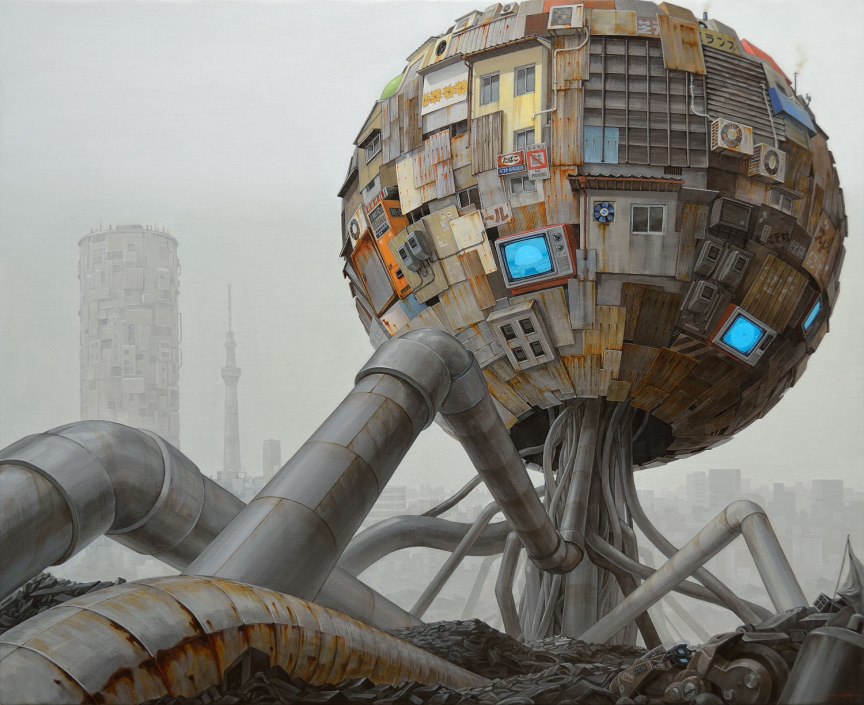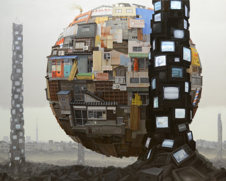 Masakatsu explains: “In this world, both individuals and groups are engaged in various economic activities. In my landscapes, I depict the unintended influence of such economic agents on daily life.”Masakatsu was born in Kanazawa, Ishikawa Prefecture, which is known for traditional Japanese handicraft. He obtained his MFA from the Kanazawa College of Art in 2000. He is still based in his home town. “Kanazawa is like a miniature garden in which the obsolete and the modern are mixed because of its distance from urban centres,” he says. “I’ve had a lot of opportunity to consider both the sense of isolation and the tide of the times. I also grew up interested in the tiny world of diorama – Bonkei, and this may have influenced my work.”