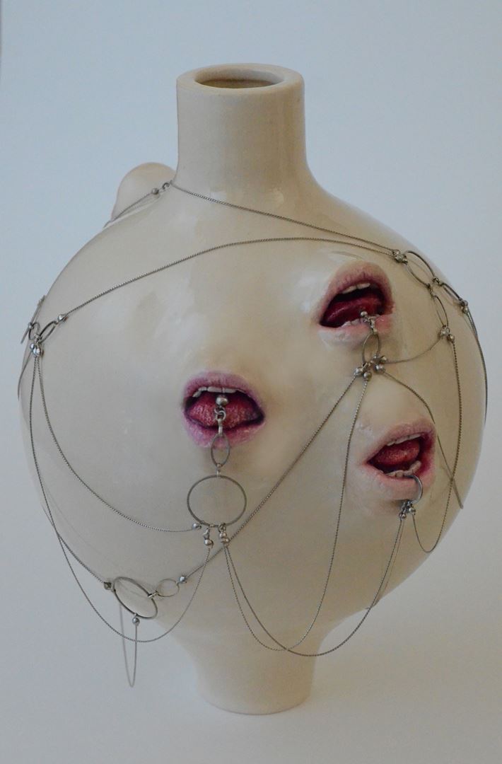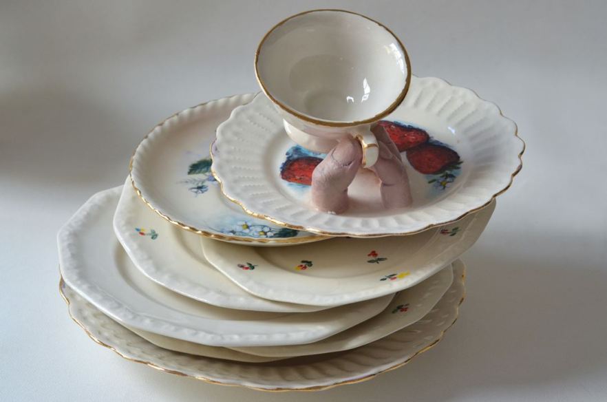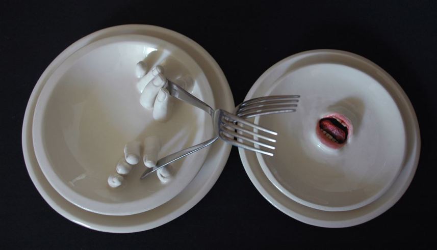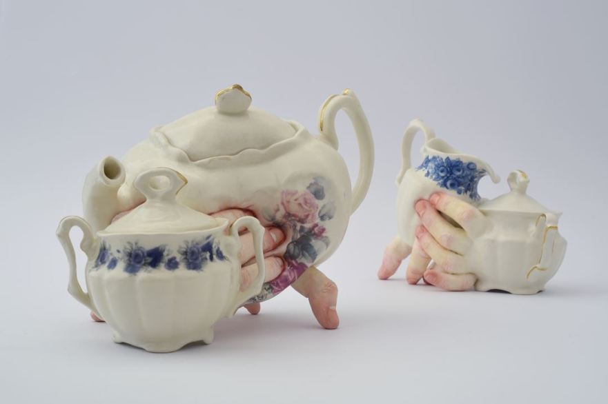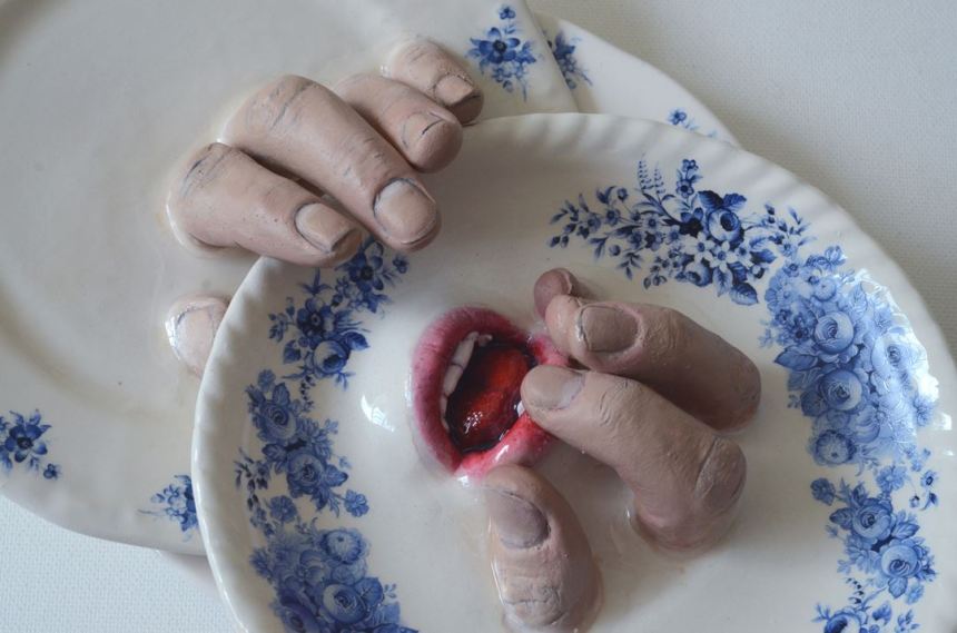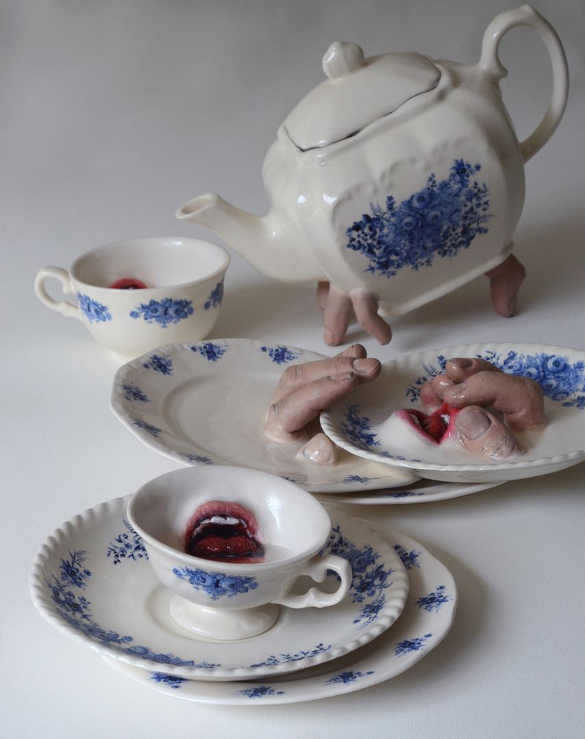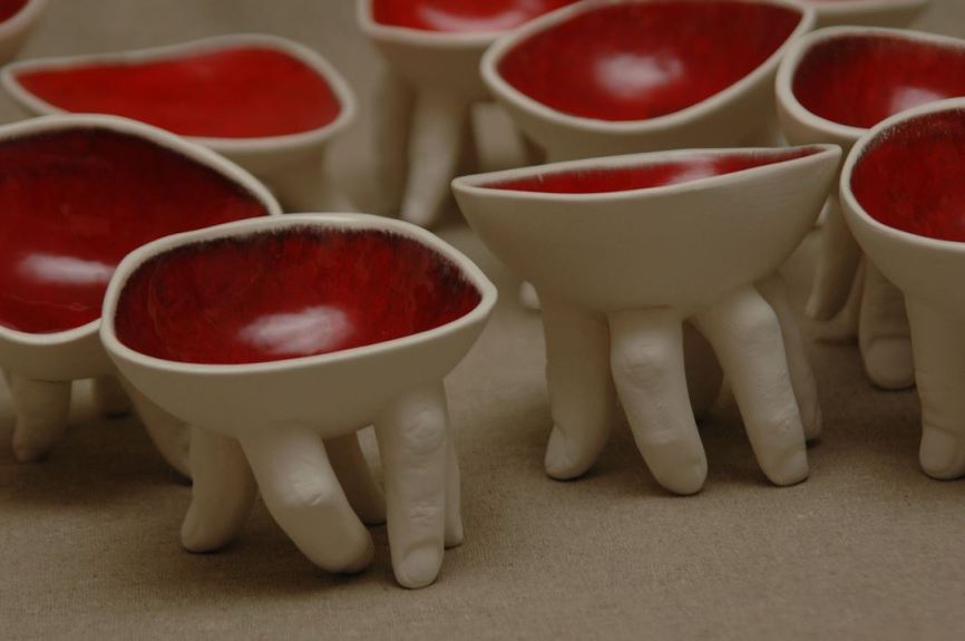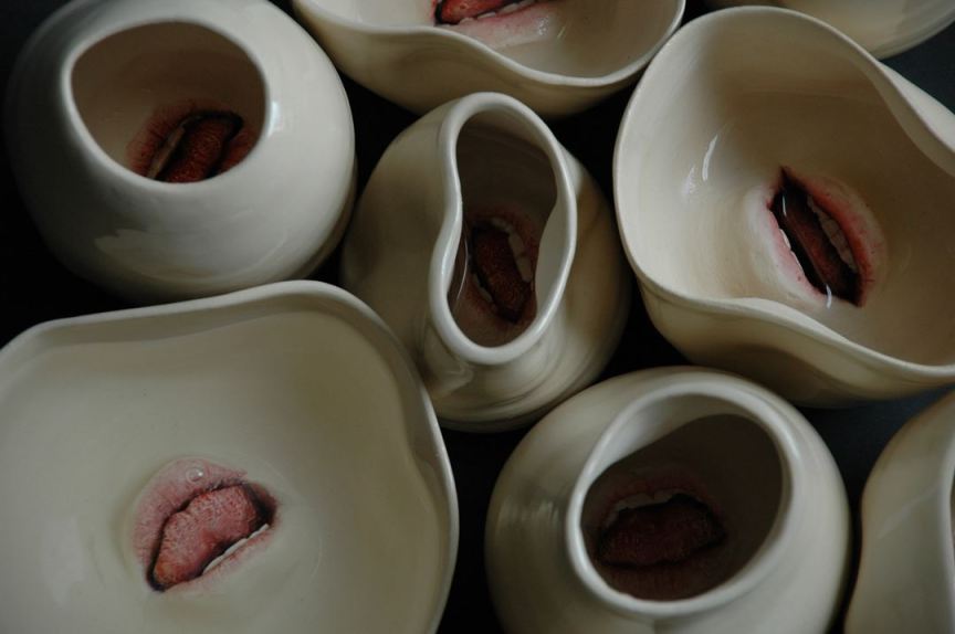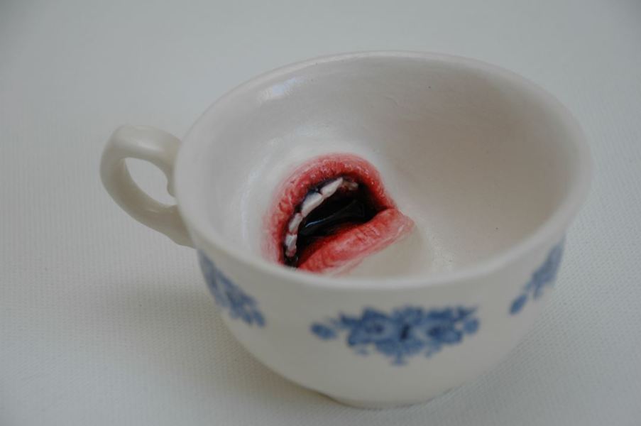 Israeli sculptor Ronit Baranga is famous for her figurative art that lies “on the border between the living and still life”. Her portfolio is large and astonishing, it includes beast-like infants and mother goddesses. Over the past few years, Ronit has come up with human mouths and fingers emerging from crockery – cups, plates and kettles.