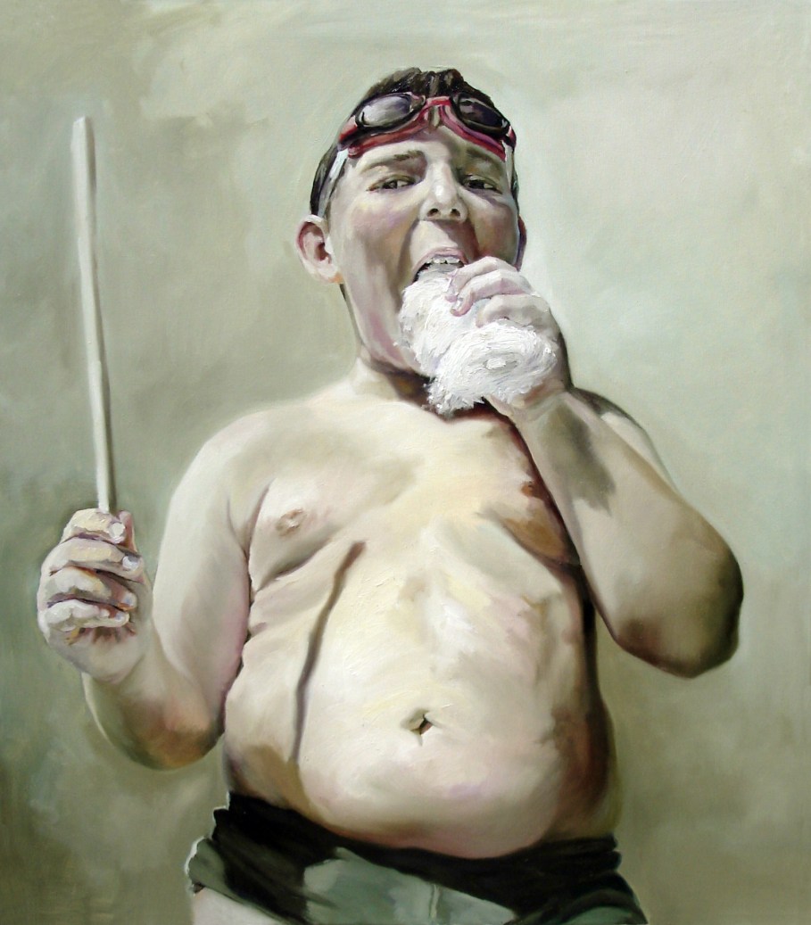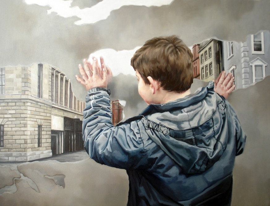 The identity crisis in Anca’s art is manifested mostly through children and youth, many of them captured in moments of confusion. One set of paintings “Accessing My Own Status” is particularly interesting. Here Anca depicts a real apple, on which she stuck a collage made out of statuses from Facebook. The painted apple appears in front of the characters’ faces, hiding their features and revealing just the following written words – “The words are energy and create realities, it depends only on us how we use them in order to create our own reality. My real identity is hidden in all artworks, leaving only the true one to be visible, through the image painted in oil on canvas.”