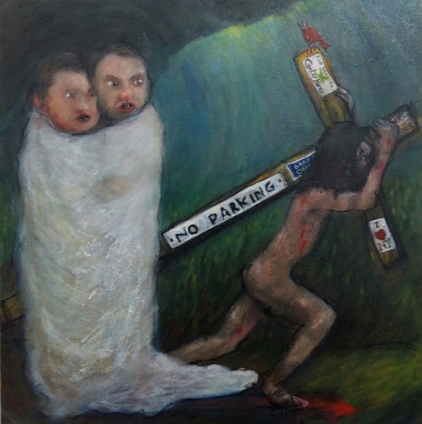 Michael Hayter says he “plunders” art history, from Giotto to Goya, from Bacon to Neo Rauch, for companionship and learning. On his content, he adds: “Finding myself in, and of, Western society and raised in its traditions of Christianity and art, I have inevitably been influenced and moulded by my environment and use this culture in the work that I make. I use these references, such as the image and person of Christ, to explore ideas of what it is to be human, as a crude cipher of one seeking to find himself and his relationship to society and (without wishing to sound grandiose) his relationship to (and with) greater Creation/The Universe.” This opens up the possibility of the figures in the car and the bar being flawed ordinary modern individuals with certain noble traits that match those of Christ. Perhaps they’ve made big sacrifices for the sake of others? Persisted after being unjustly punished?