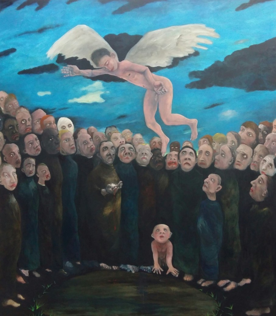 A bunch of naked humans crying out in self-pity in a desolate landscape, people moving with their little houses tied to their backs, a man before a table who is down on his luck, Jesus in a car and a bar – British painter Michael Hayter’s body of work is made of up of such dark and funny pieces. Intuitively created, they look childlike in style even though their themes easily remain adult in nature.