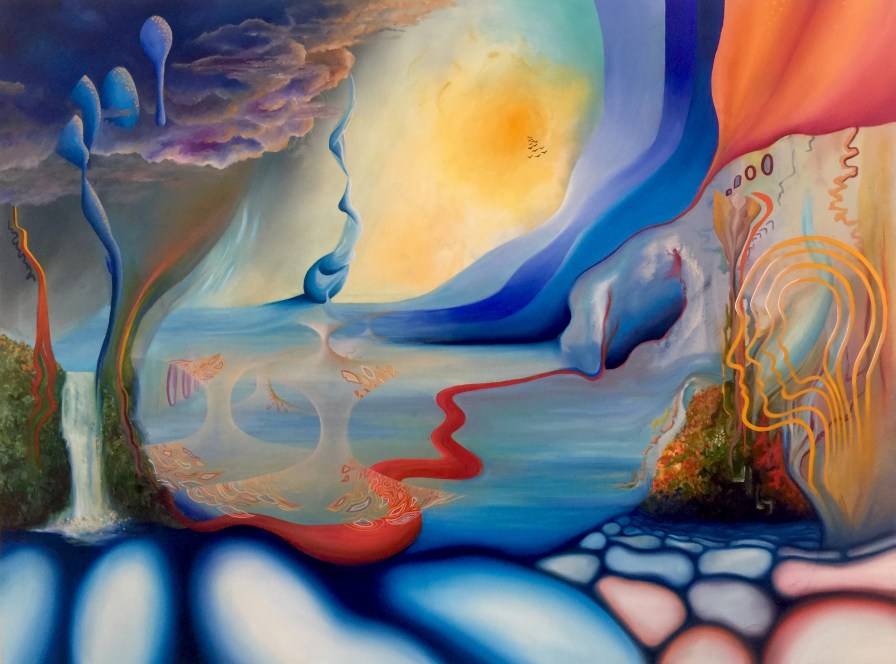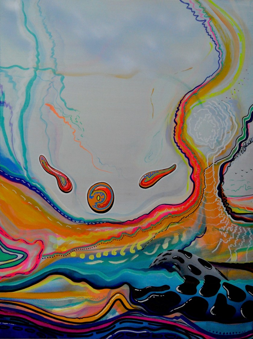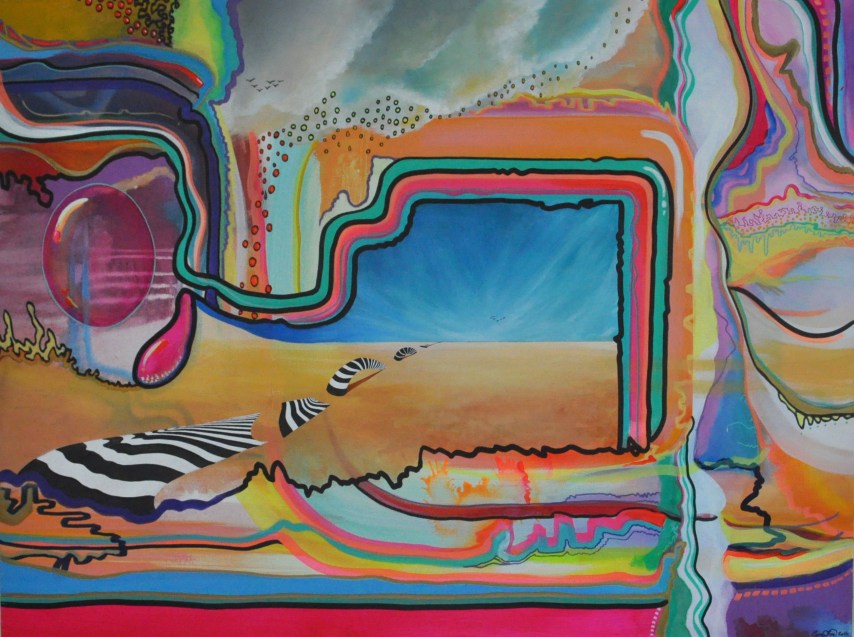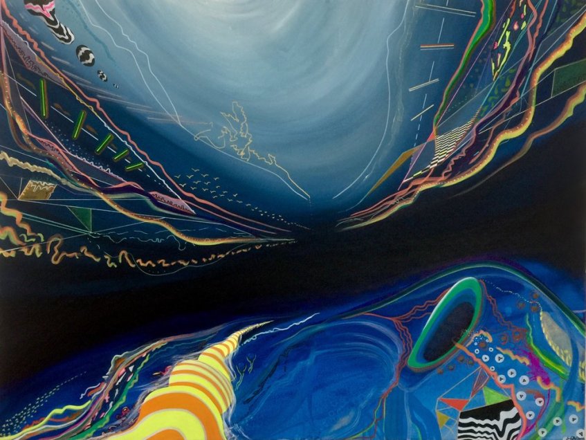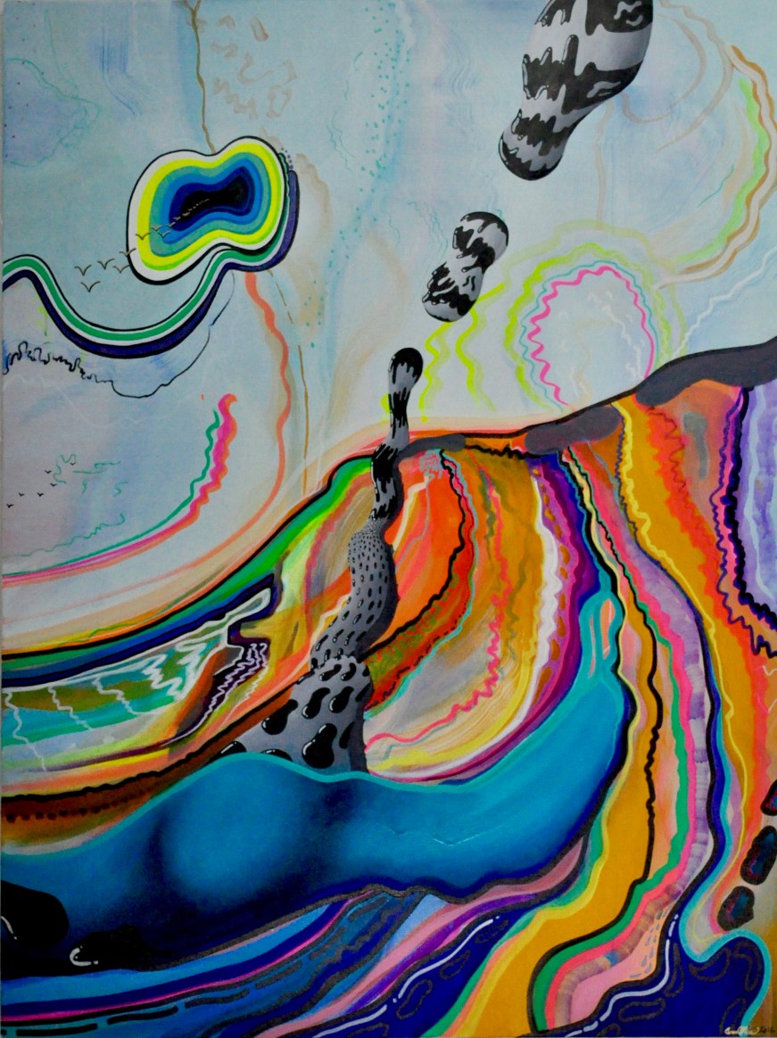 New York-based artist Connie Rose is known for her exciting mix of abstraction and surrealism that takes the viewer on a colourful journey of electrifying visual energy to imagined worlds. Shapes and shades are in a constant state of flux, the landscapes displayed are at once alien and familiar. The themes explored are intuition, passion, wonder and the limitless possibilities of universes. The pieces are inventively titled – “Will You Chase The Horizon Or Let It Flow Through And Beyond You?”, “The Brief Transparency of Truth”, “The Space Between Two Universes”…