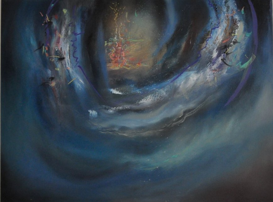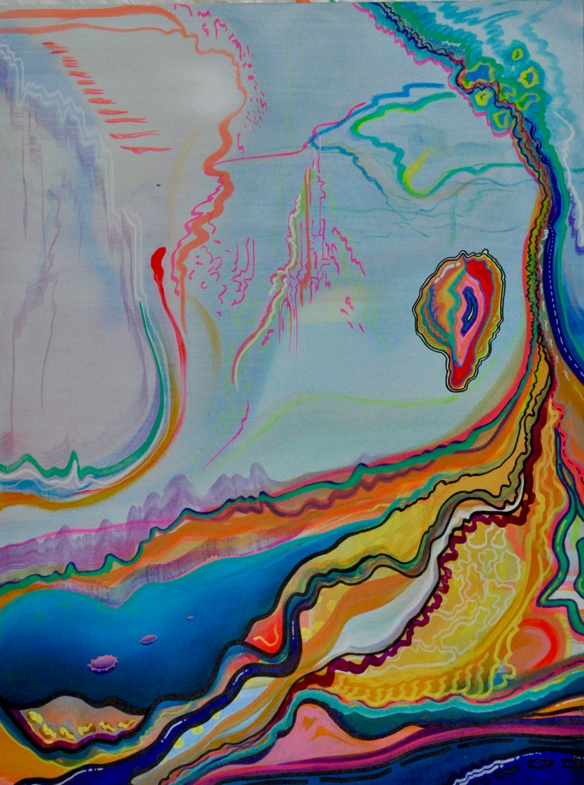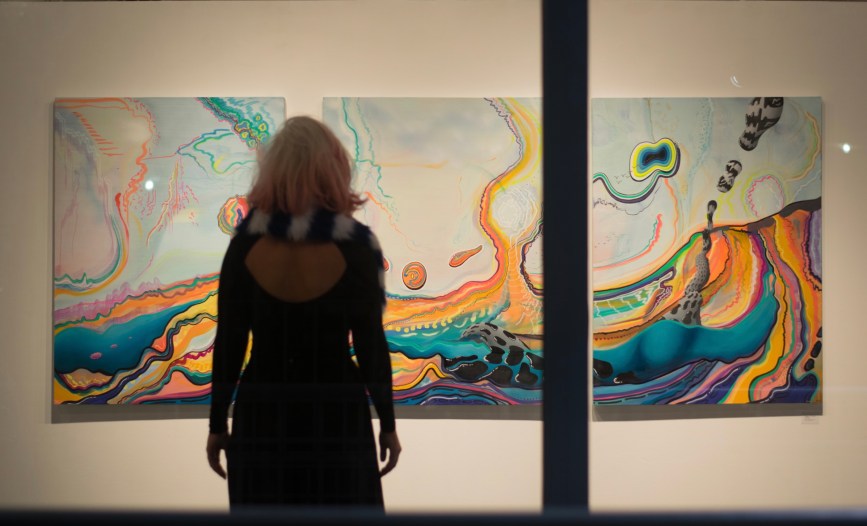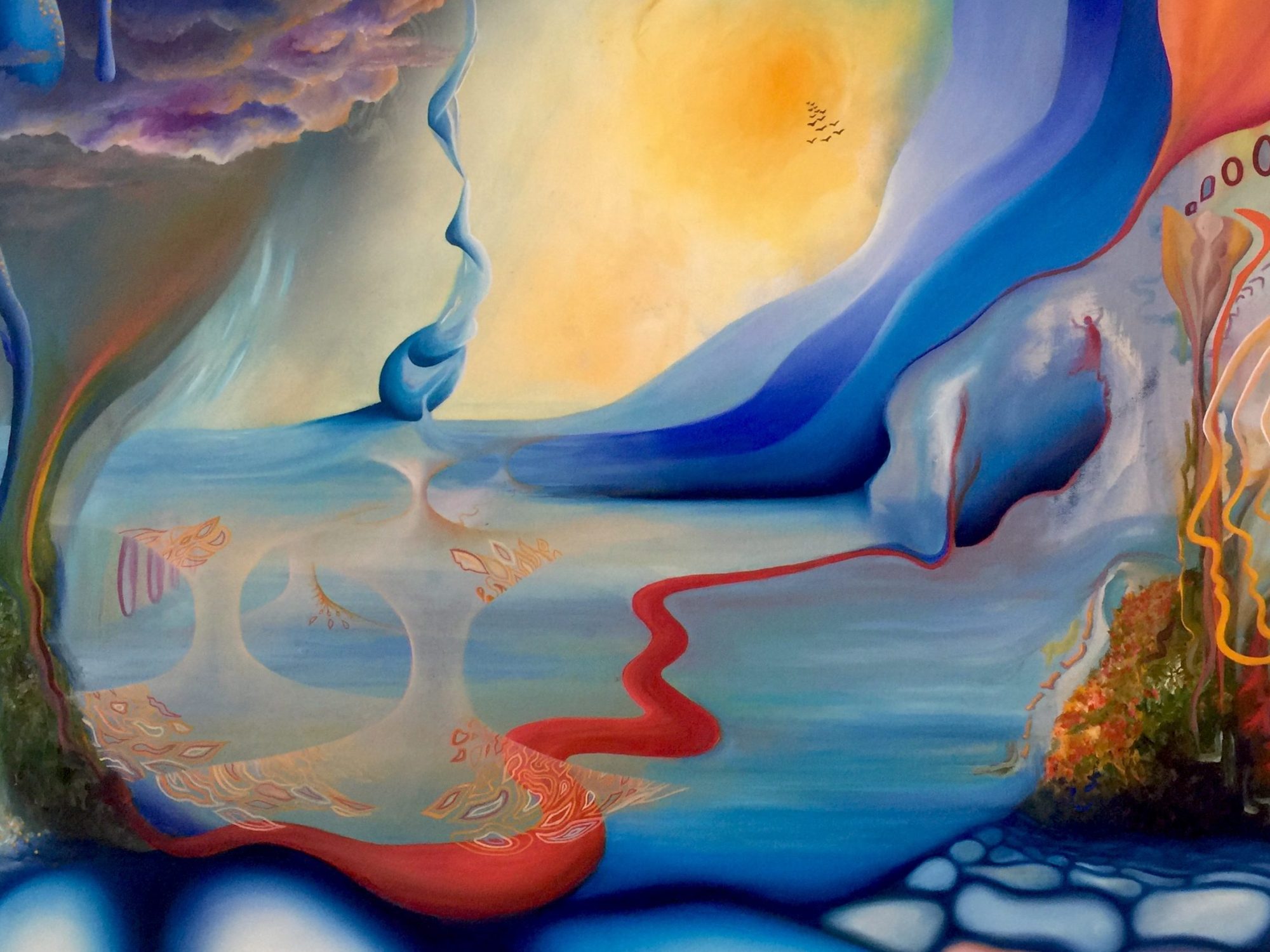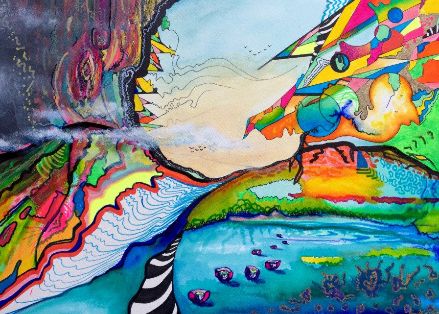 New York-based artist Connie Rose is known for her exciting mix of abstraction and surrealism that takes the viewer on a colourful journey of electrifying visual energy to imagined worlds. Shapes and shades are in a constant state of flux, the landscapes displayed are at once alien and familiar. The themes explored are intuition, passion, wonder and the limitless possibilities of universes. The pieces are inventively titled – “Will You Chase The Horizon Or Let It Flow Through And Beyond You?”, “The Brief Transparency of Truth”, “The Space Between Two Universes”…