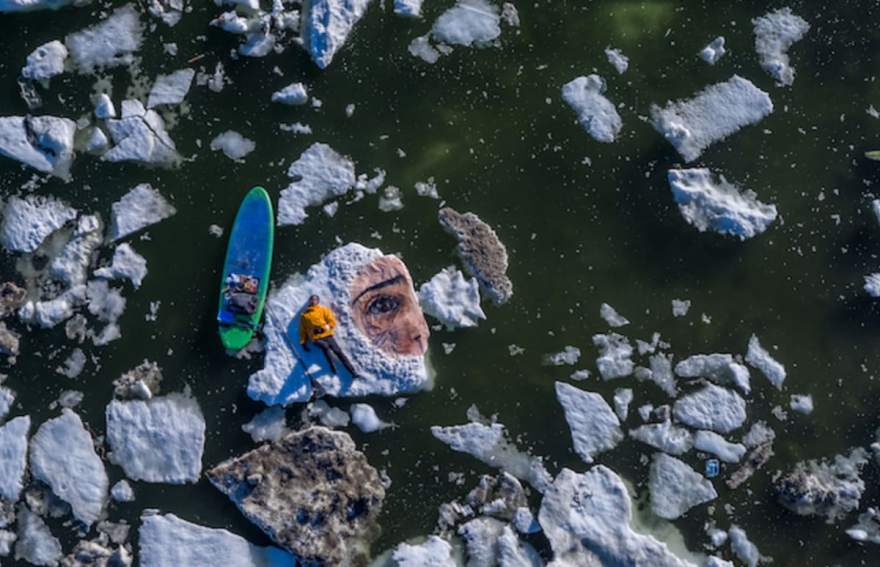 According to Sean’s website: “Hula strives to bring life to empty spaces, usually working on shipwrecks, abandoned docks and forgotten walls. Merging his backgrounds in both street and fine art, Hula works entirely with oil paint and uses traditional techniques to create soft, female figures interacting with the surface of the water. Hula’s work often leaves you feeling an array of emotions while proposing an environmental discussion. His work can be found on public walls and in galleries worldwide.” The pressing issue of climate change immediately comes to mind.