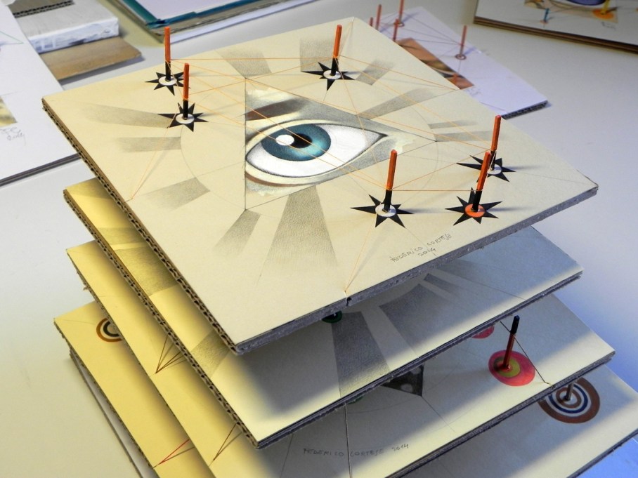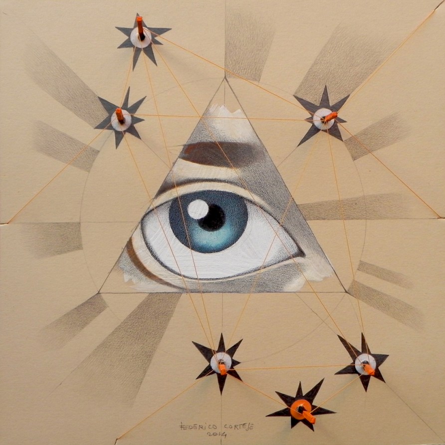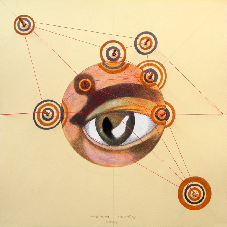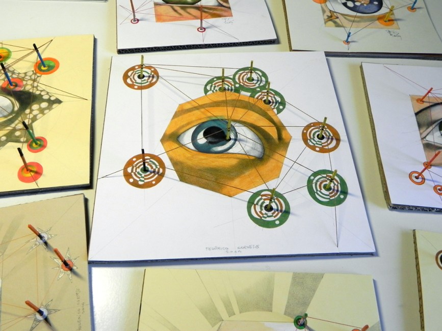 Federico writes: “I always liked to draw eyes. Individual eyes, wide eyes, groups of eyes, half closed eyes. I would change the expression or play with colours and decorations as if drawing were make-up, allowing endless variations. The constellations in the sky are endless as well, and I drew these too, as if they were geometric embroidery created for the sole purpose of interpreting a reality difficult to understand. Then, when the verse of a mawkish romantic song came into my thoughts (“The starlight is reflected in your eyes …”), I could not resist the urge to create a new series, based on the union of those two, which have nothing to do with each other and are related only by the fact of being homogeneous sets, ready to be classified to quench the thirst of an artist that is anxious to bring order into his chaotic imaginary world.”