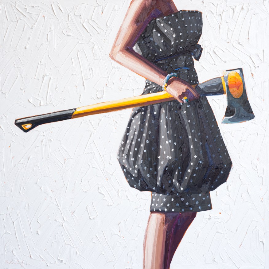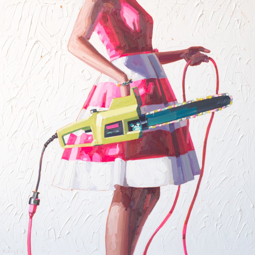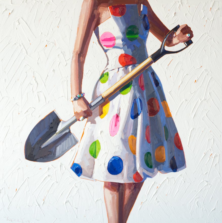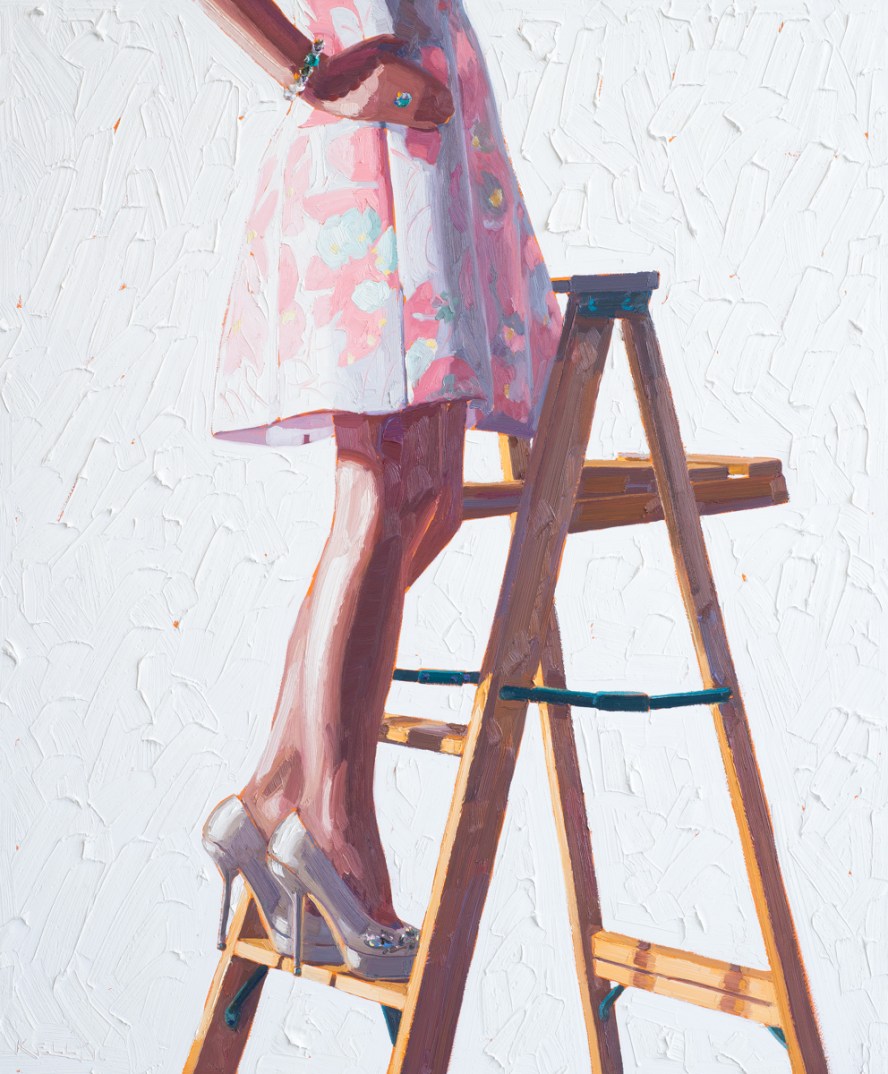 The audience may immediately come up with two questions upon examining these paintings. Why are the faces/heads hidden? Second, why are the clothes so retro, almost 1950s? Kelly keeps the torsos anonymous because she wants the female viewer to be able to see herself in the painting. The incompleteness of the frame is an invitation – as in, come on in, finish the narrative the way you want.