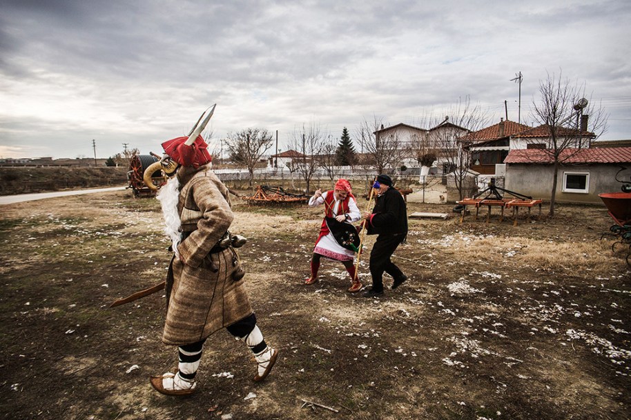 The photographer continues: “Purpuris would get dressed inside the local cultural club, whereas the dancers would dress up in Didymoteicho. Purpuris has to wear a mask at all times and never show his face. This mask is made of a pumpkin. Its original purpose was to hide the faces of the guerrilla soldiers who wanted to visit their families during the fight for independence. They would dress up like that, pretending to serve the custom, and they were able to come and visit their loved ones.”