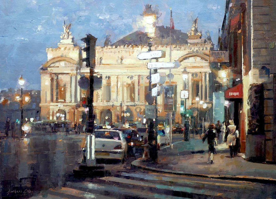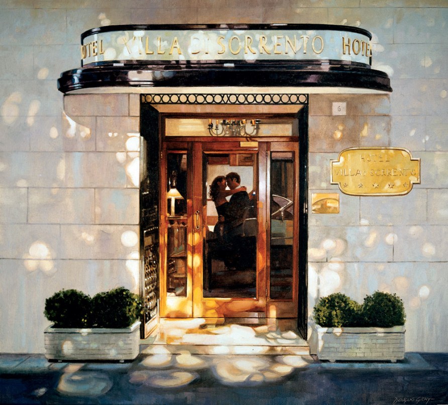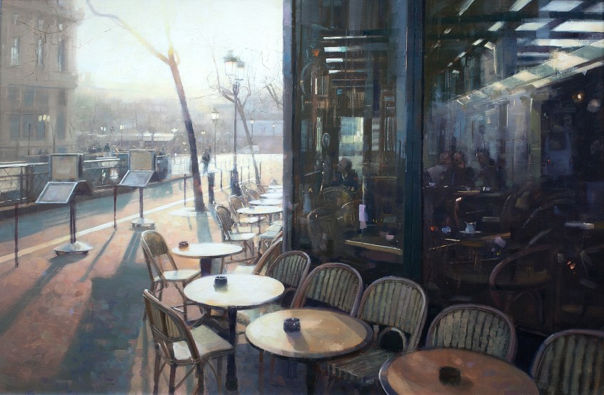 Award-winning English artist Douglas Gray (born 1965, Harrogate) creates realistic yet dreamy scenes of spots in places like London, New York and Paris—showing lonely women in cafés, male friends bonding over beer, the sun over glass, rain over a bridge. Every piece reflects a sense of wonder and great love for the modern city. The painter finds a wealth of creative inspiration from people themselves. He immerses himself in the textures and tones of life and uses the power of his art to ignite the viewer’s imagination and evoke emotions.