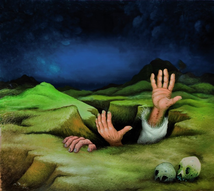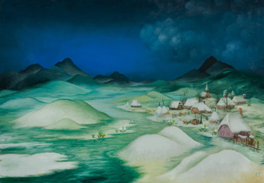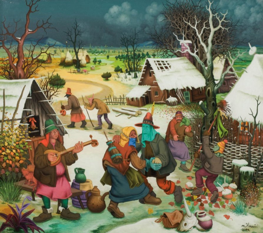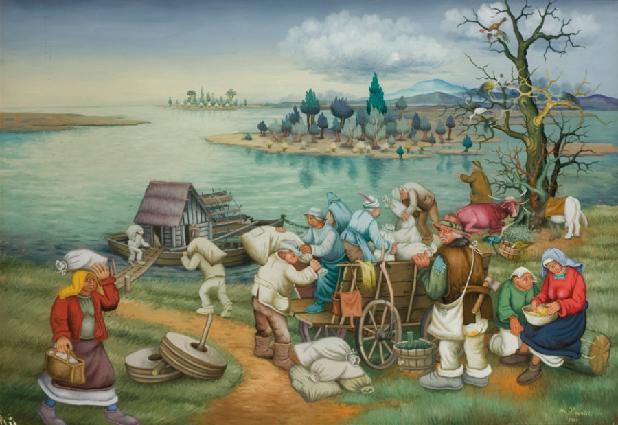 Academic and art critic Tonko Maroević, who is associated with the Institute of Art History in Zagreb, explains further: “With his memory he has evoked the rural environment almost unspoilt by civilisation, and his paintings renew the existential premises of action in limited, ‘untamed’ conditions of existence in a so-to-speak authentic natural setting. It has been said, and supported by many good reasons, that Kovačić’s painting are often of a medieval character, imbued with religion and mystique, inspired by apocalyptic suggestions and a Bosch-Bruegel-like narrative style.