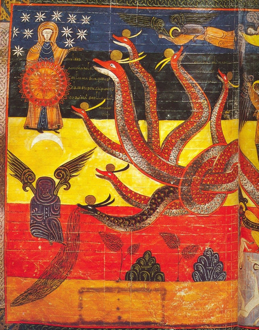 Facundus Beatus, f. 186v: ‘”And there appeared a great wonder in Heaven; a woman clothed with the sun, and the moon under her feet, and upon her head a crown of twelve stars: And she being with child cried, travailing in birth, and pained to be delivered. And there appeared another wonder in Heaven; and behold a great red dragon, having seven heads and ten horns, and seven crowns upon his heads” (Revelation, 12.1-3), Wikipedia [Public Domain]
