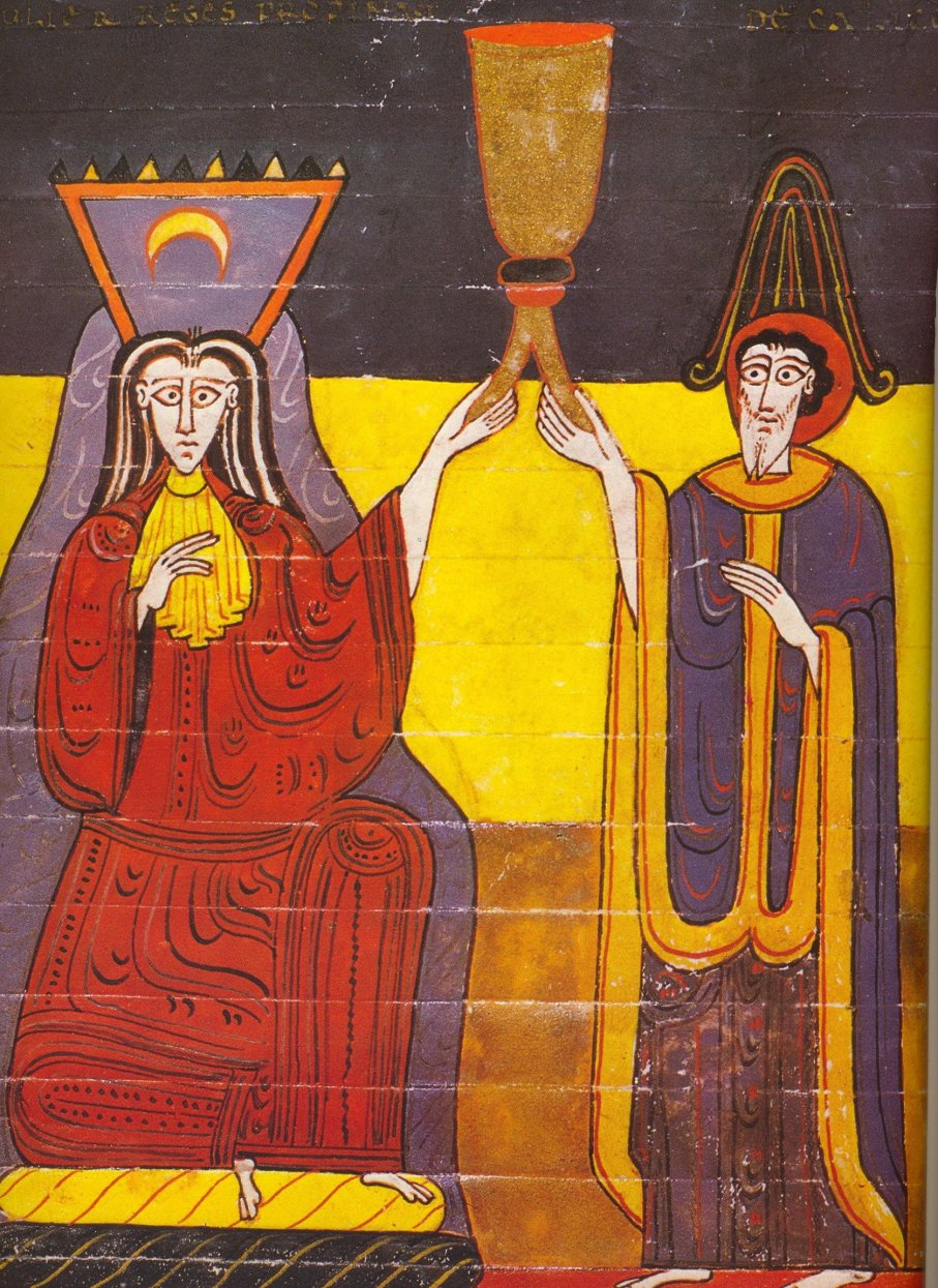 Facundus Beatus, f. 224 (detail): “And the woman was arrayed in purple and scarlet, and decked with gold and precious stone and pearls, having in her hand a golden cup full of abominations, even the unclean things of her fornication, and upon her forehead a name written: «Mystery, Babylon the Great, the mother of the harlots and of the abominations of earth.»” (Revelation, 17.4-5), Wikipedia [Public Domain]