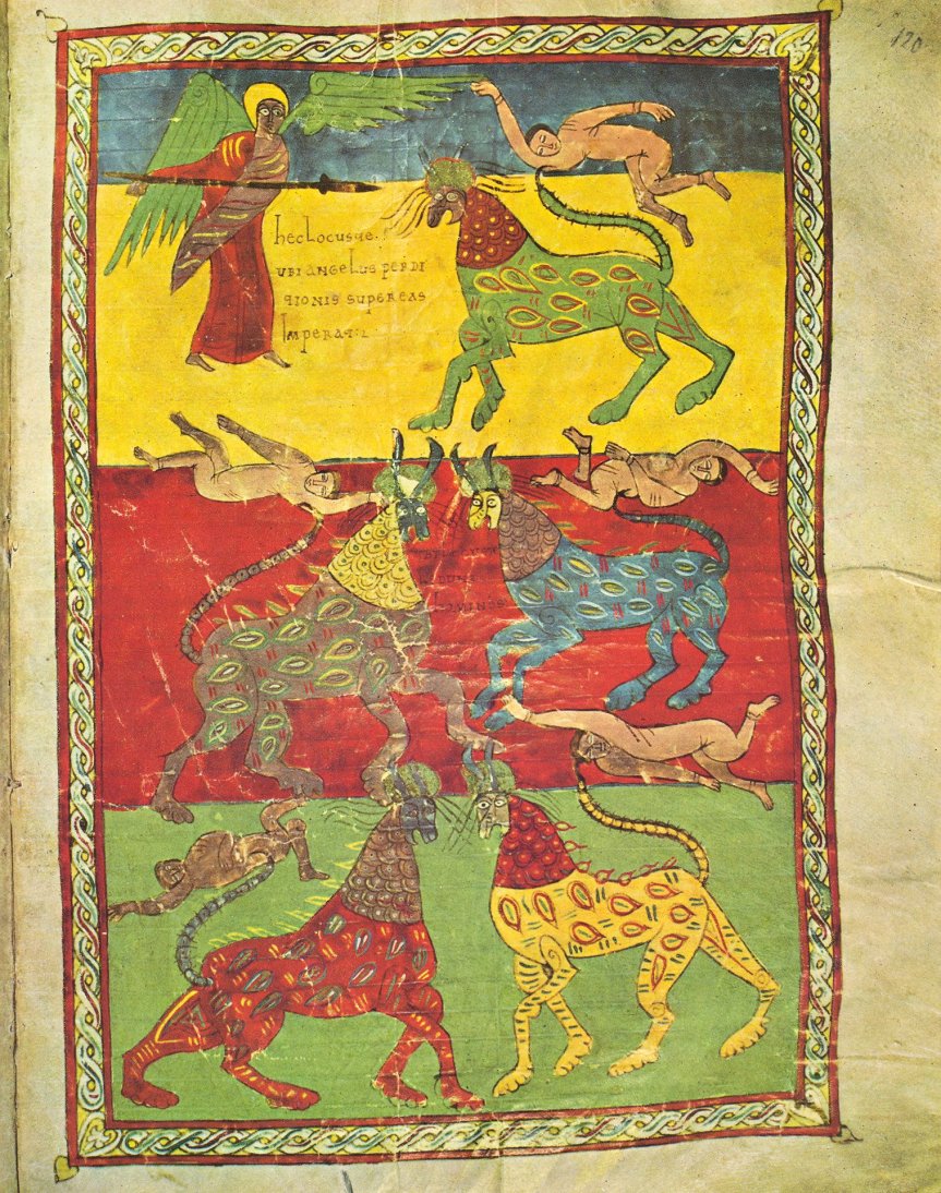 Valladolid Beatus, f. 120: The Angel of the Fifth Trumpet: “And the fifth angel sounded, and I saw a star fall from heaven unto the earth: and to him was given the key of the bottomless pit” (Revelation, 9.1), Wikipedia [Public Domain]