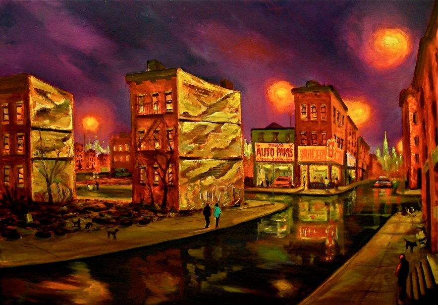 ‘Urban blight’, ‘the pre-programmed American urban ghetto’ and ‘how people persevere in the face of what is often called willful neglect’ are the main subjects of Brooklyn-based artist Jack DeMartino. Executed mostly in shades of thick brown, red, yellow and purple, the paintings present to us visions of New York neighbourhoods hit by foreclosure, arson and abandonment. The scenes speak of loss and poverty but manage to remain alive with an energetic, almost comic-book glow. There is a deep story behind these artworks, one that includes instances of racial discrimination and substance abuse.