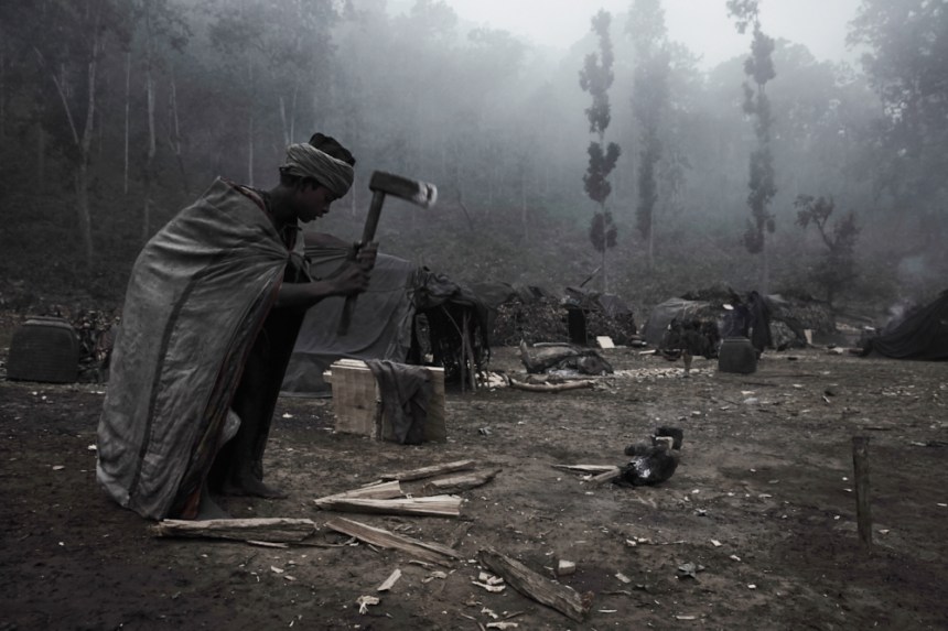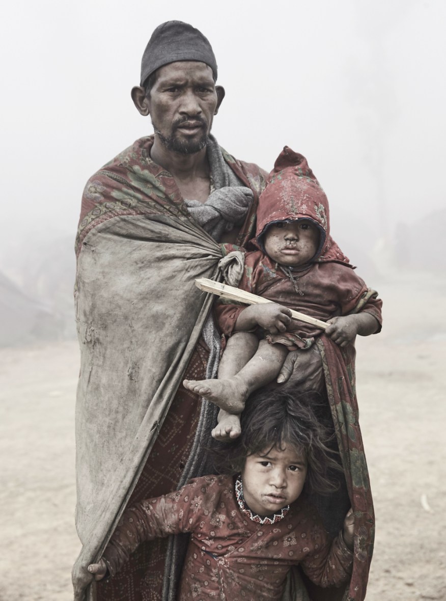 They call themselves “Kings of Forests”, and subsist on langur and macaque monkeys, wild yams, rice and a few kinds of vegetables traded from local farmers. Their main occupation is the exchange of wooden items in nearby villages and bazaars. They often migrate from river valleys up to middle hills in the Western region of the country. In these haunting yet captivating photographs, we see them in a grey cold space. The men, turbaned and clothed in dull fabric, hammer wood. The women, well ornamented in red and blue, smoke and look after children.