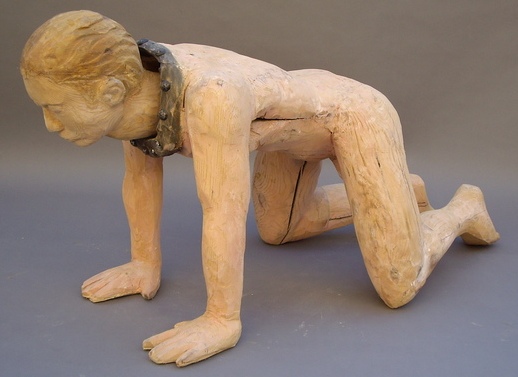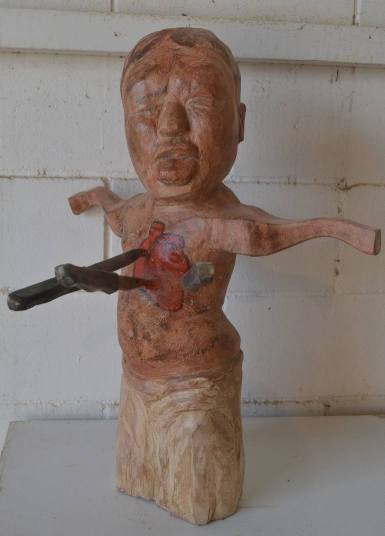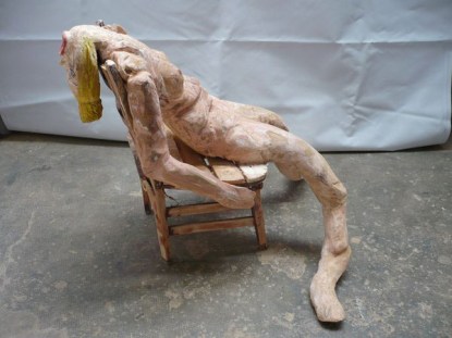 The Spanish religious wooden sculpture is one of my main influences. And I like to play with and distort its original meaning to depict a contemporary understanding. As the Neoliberal philosophy uses and perverts the Judeo-Christian moral, I use and pervert Catholic imagery, carving and sculptures. Through irony, humour and absurdity, these figures help us to think about our place in the present-day social machinery.
