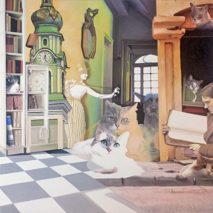 The checkered floor, for example, stands for dualism, the concrete choices that man makes in life, the division between superior and inferior natures. White and black is also positivity and negativity. The square shape of the chessboard is matter, the number four (the four sides of the square) in numerology represents all that is solid and tangible. In some paintings, such as in “Micioni” and “The Magical World of Cats”, cats are the theme specifically requested by the client. But usually I use the cat as a symbol of freedom and protection from danger.