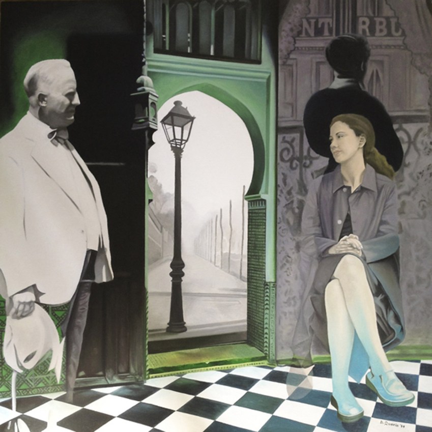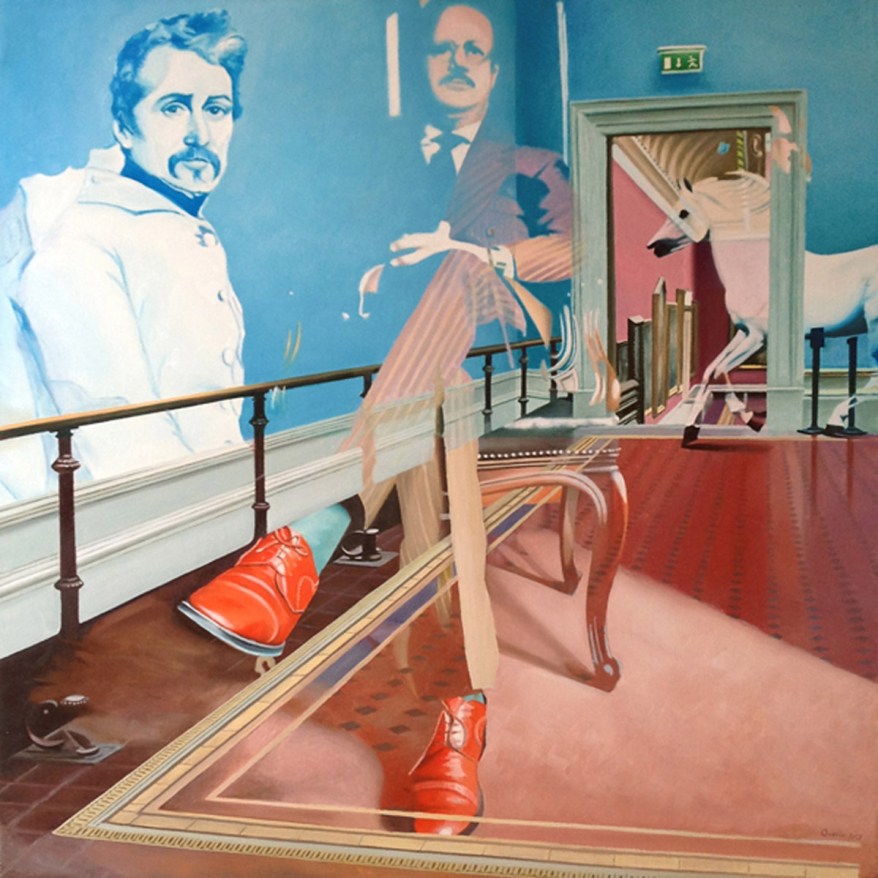 This painting depicts two parallel paths: on the right, a corridor with a statue of the classical period that represents our history and our Western culture, the tradition and profound values of classical art, our solid cultural roots. Further on, in the foreground, two characters from the early twentieth century appear, they represent the continuity of these concepts, but with an element of loss, symbolised by the transparency of their lower limbs.