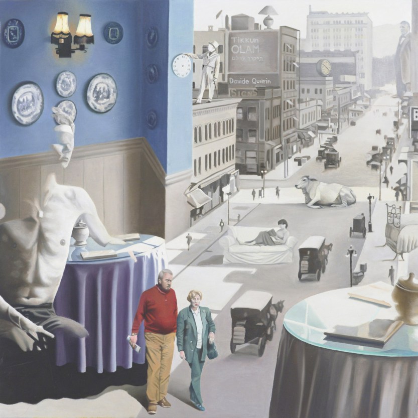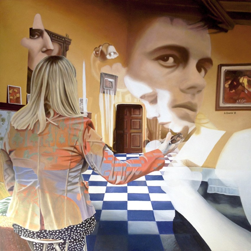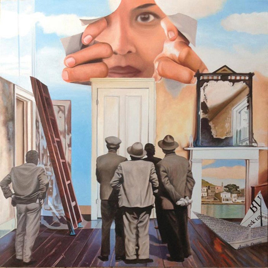 All those who have seen this painting missed the presence of an optical effect: the bases of the door jambs on the right are not on the same perspective plane. I have used this optical effect to say that our past and our present seem to be separate in space and time, but coexist on the same plane, just as the whole scene of the painting, that, while representing different temporalities, coexists on a bi-dimensional canvas and in a single square-shaped area.