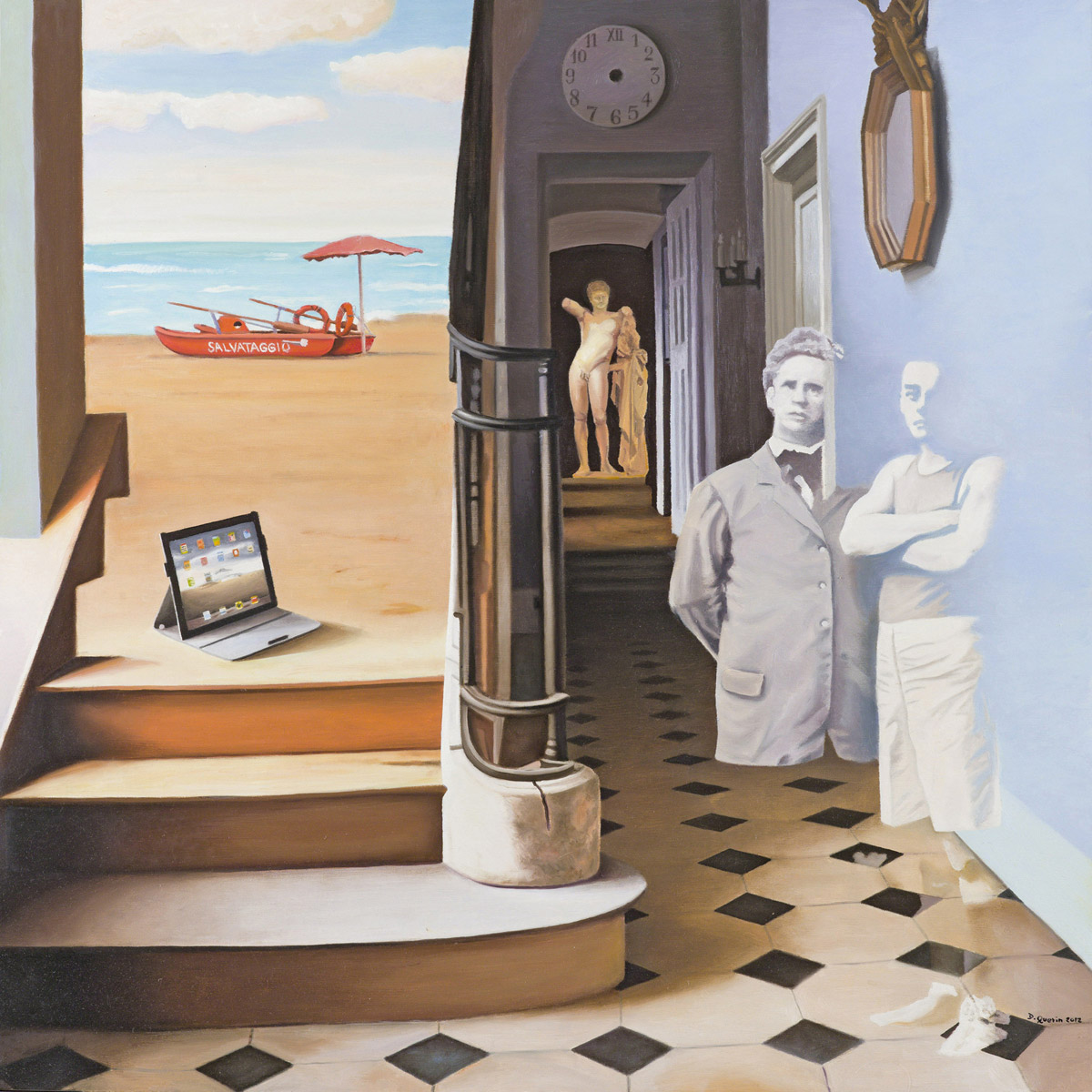 All those who have seen this painting missed the presence of an optical effect: the bases of the door jambs on the right are not on the same perspective plane. I have used this optical effect to say that our past and our present seem to be separate in space and time, but coexist on the same plane, just as the whole scene of the painting, that, while representing different temporalities, coexists on a bi-dimensional canvas and in a single square-shaped area.