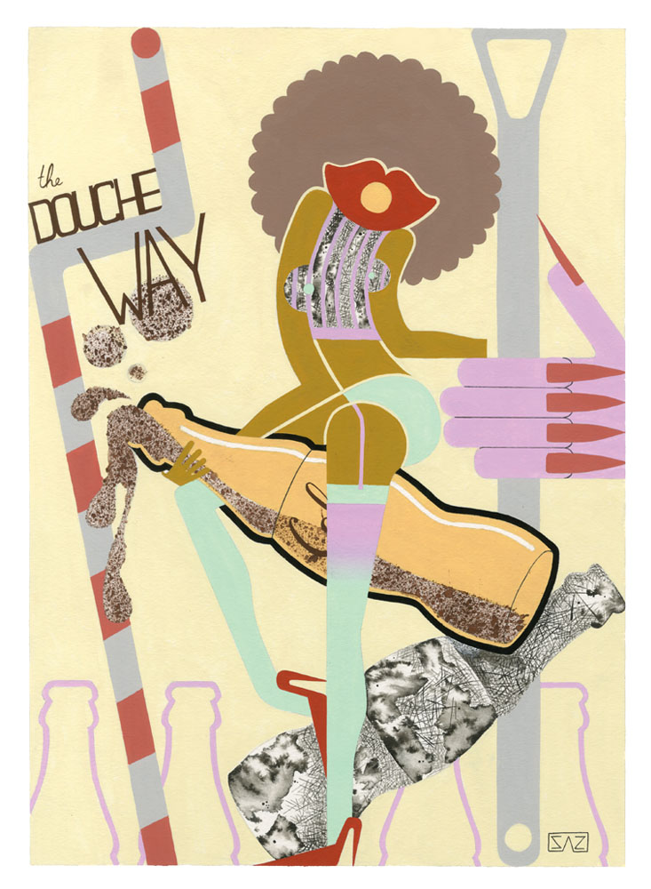 She explains her playful and probing work: “Since ancient times, people have found new and bizarre ways to avoid conception. Inspired by historical contraceptive practices, ‘Miscontraception’ illustrates current issues surrounding sex and addresses the antiquated ways human beings respond to these problems that seem to persist despite all logic. Factual outdated contraceptive practices are used as props or ‘defense mechanisms’ in each illustration to question why these issues still occur even though this generation is provided with tons of information regarding preventions.