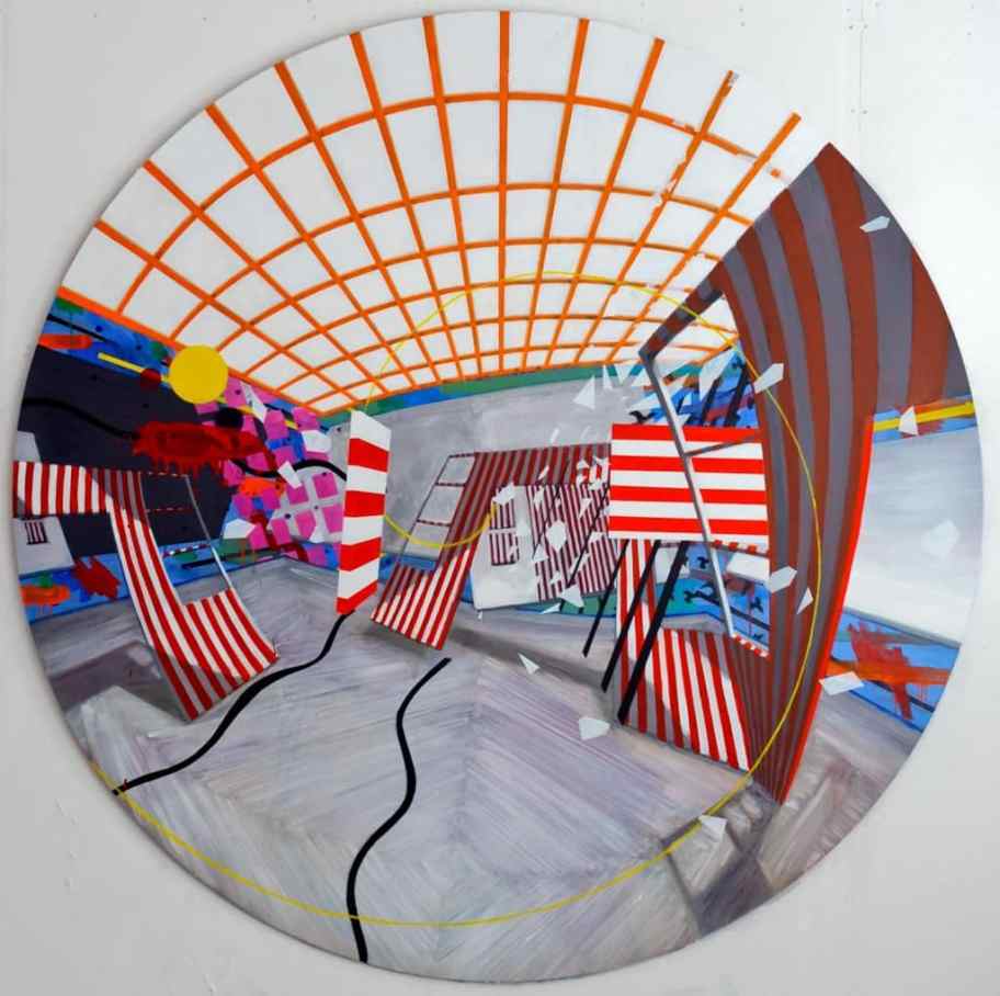 The title of the painting At The Border Between the Official and the Excluded is a quote from an interview where Nicolas Bourriaud discusses the link between politics and art.