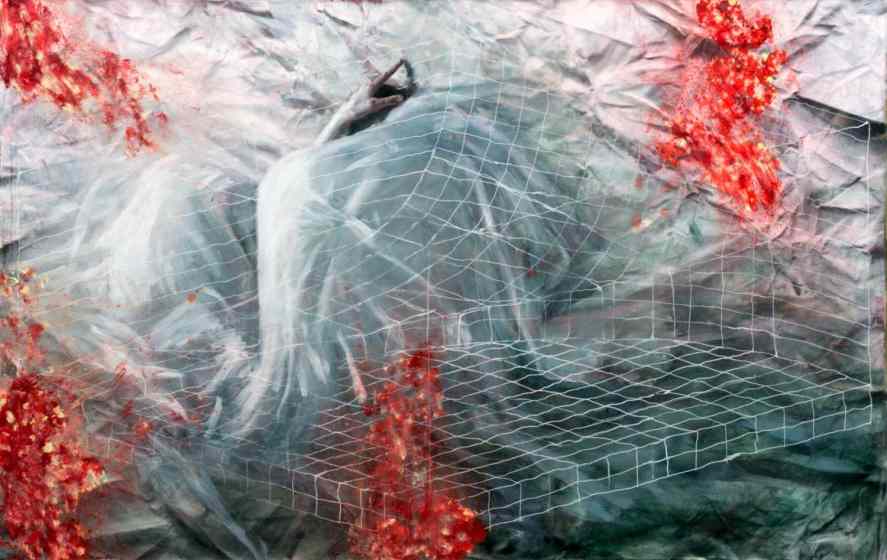 I have wanted to capture a dystopian sense of absurdity and artificiality. This is a reaction to the political situation in Europe, with people who die in the Mediterranean. But, I do not believe I have the right to paint the situation of vulnerable people. Thus, the painting describes an interpretation of the privileged people in Sweden as a collective. I myself am one of these privileged people.