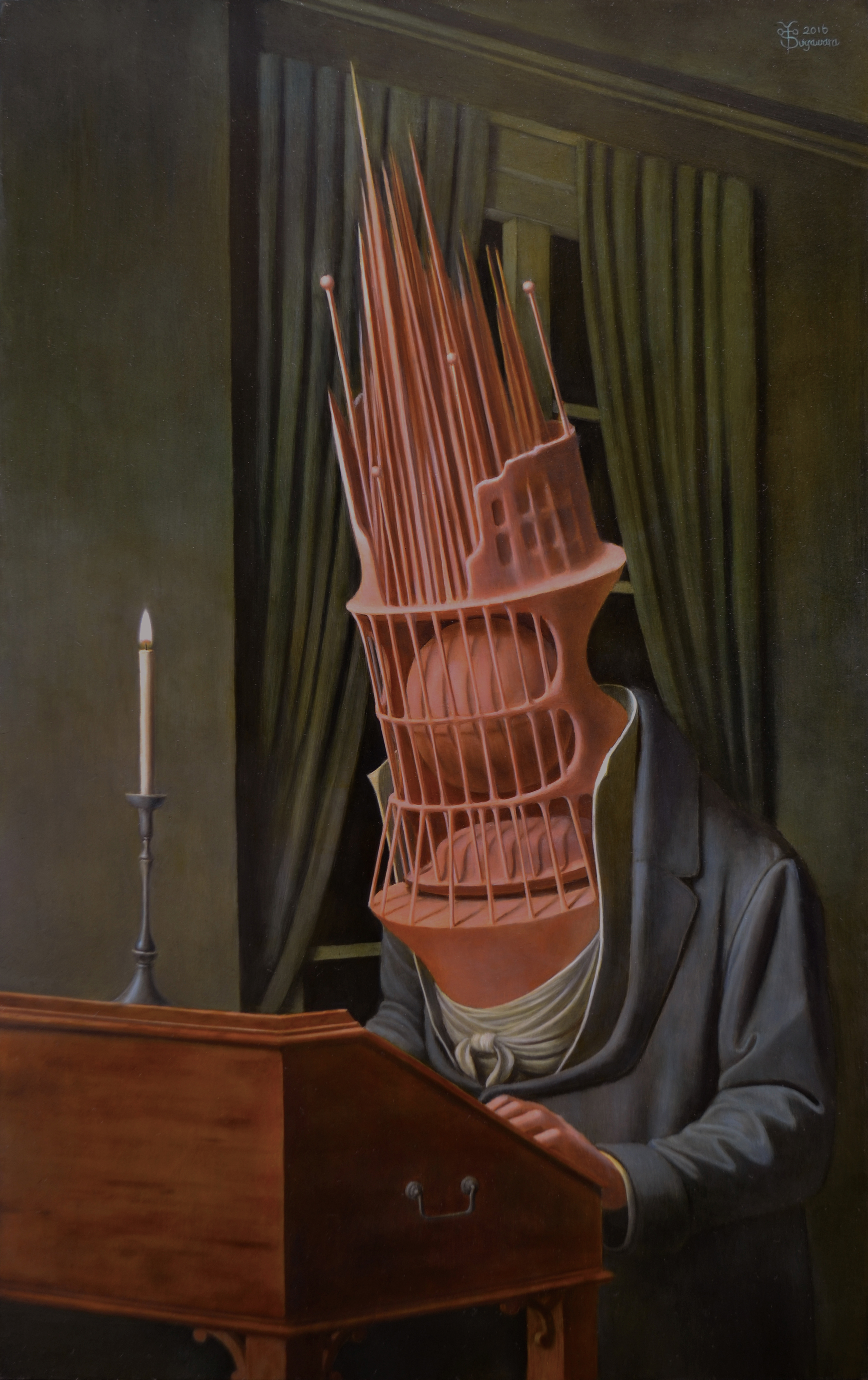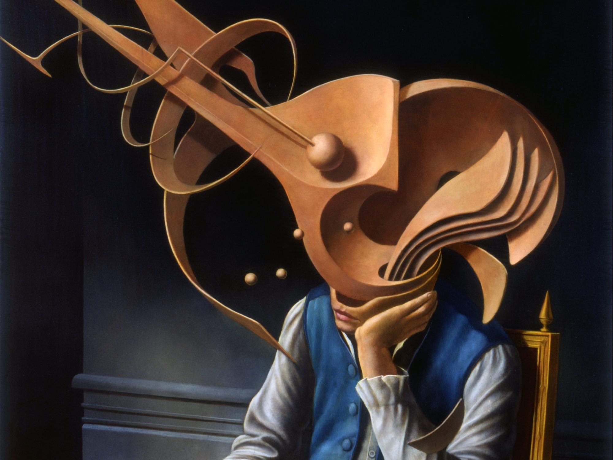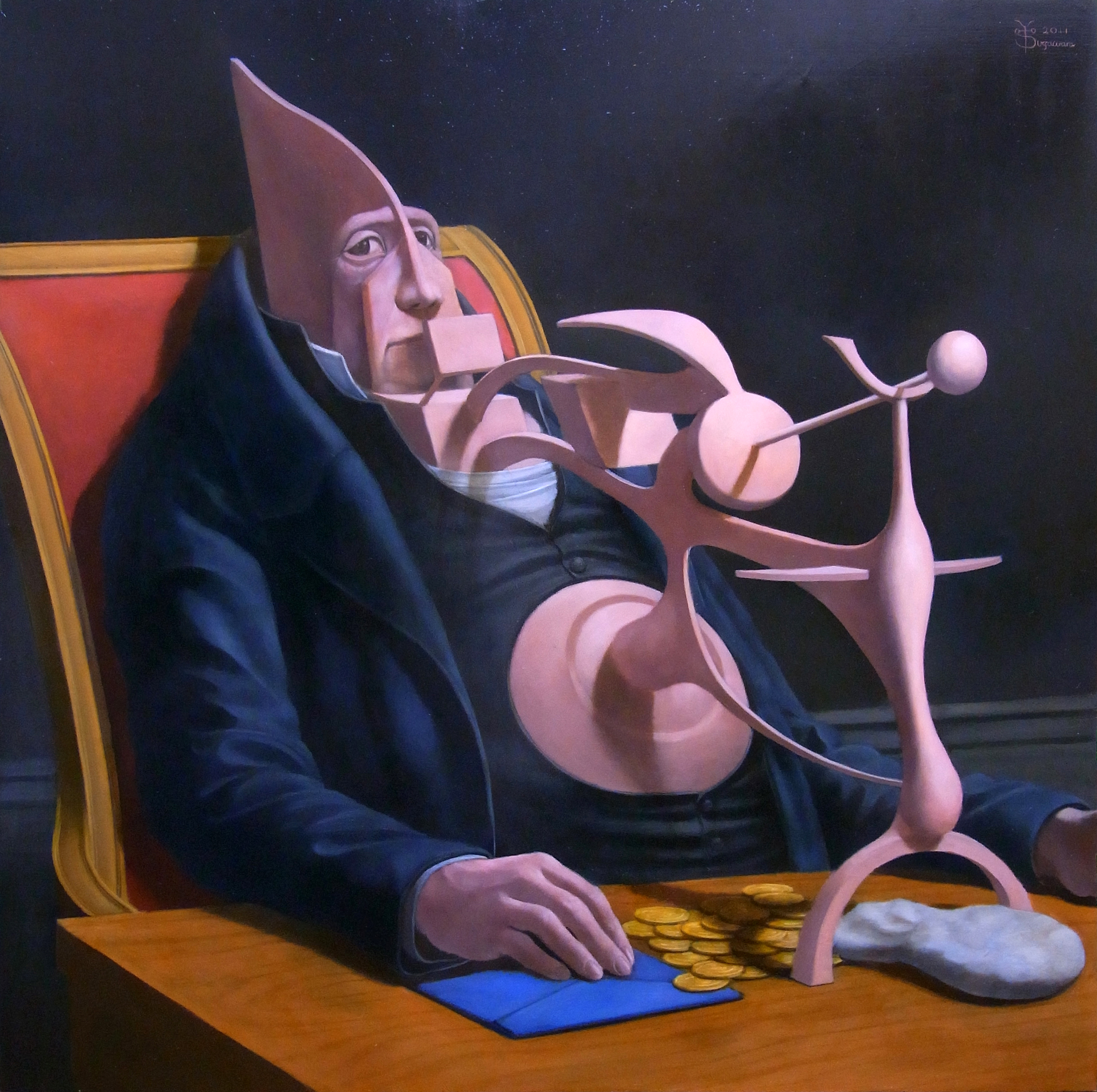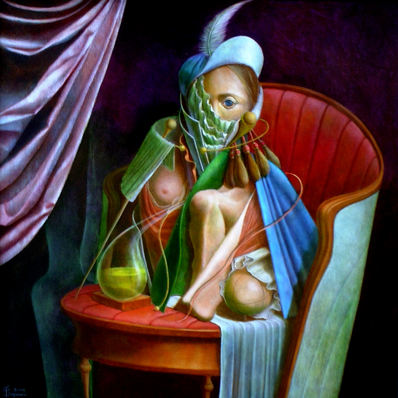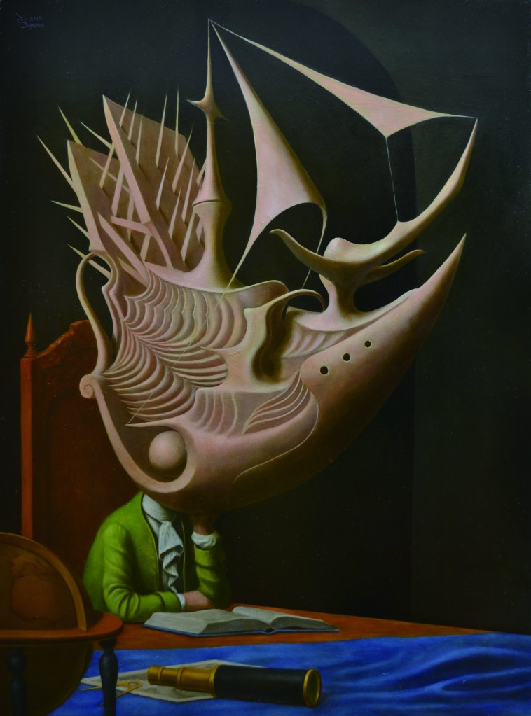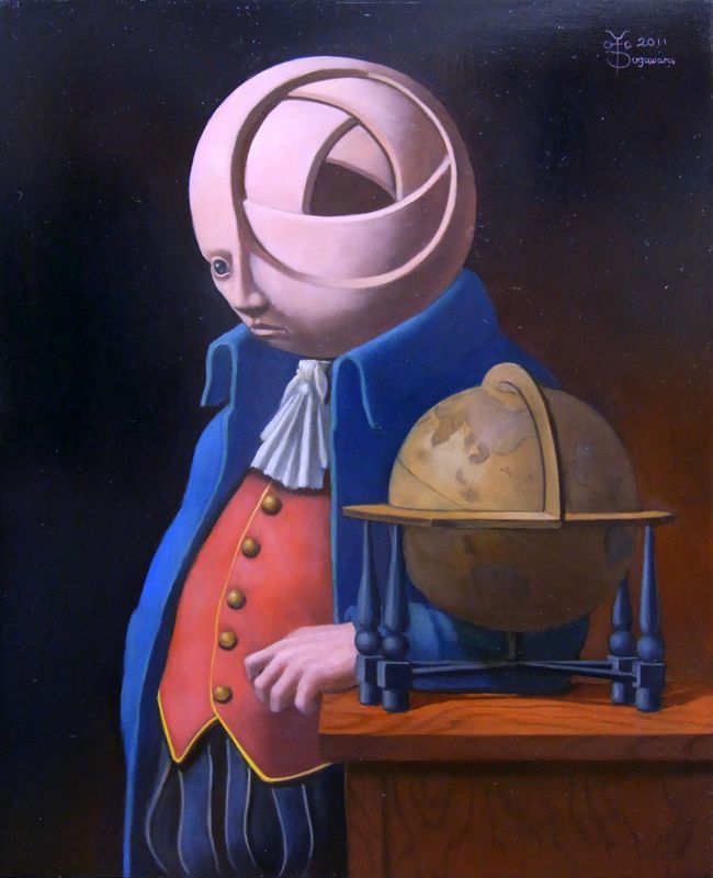 Yu sees everything as a construct and creation—from rules to nations to God—a product of our extraordinary capacity for dreaming and mythmaking. His paintings are basically metamorphosed portraits where he innovatively depicts the mental processes of characters (as in stewards, writers, geographers) or some behavioural quality (say, trust between a man and a woman). He stretches the skin or carves the skull of his subjects, making them strange, grotesque, humorous, even beautiful.