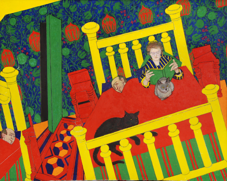 These works, which can be seen as a celebration of Patricia and Utermohlen’s life together, describe the warmth and happiness of their apartment and the joy they took in the companionship of friends. However, indications of the disease that is about to strike the painter are also apparent in the shifting perceptions of space, objects, and people. They are premonitions of a new world of silence and sensory deprivation about to close in on the artist. Clearly the artist’s most openly biographical pictures, this cycle centers on his wife, his friends, and his immediate environment: the objects, books, and paintings that have made his life meaningful and towards which he feels the greatest attachment.
