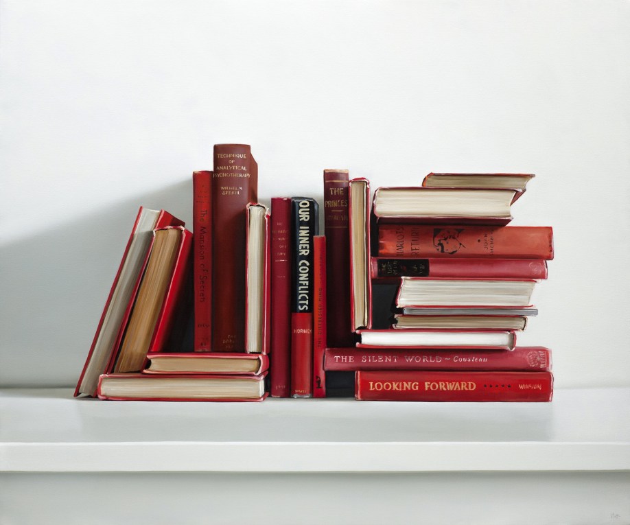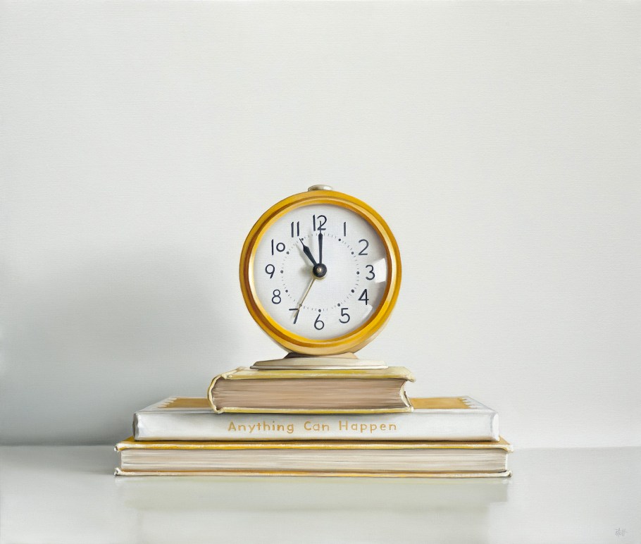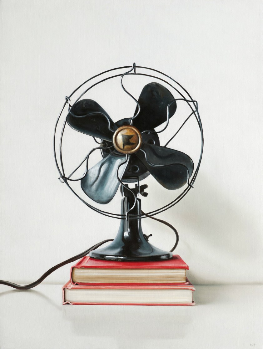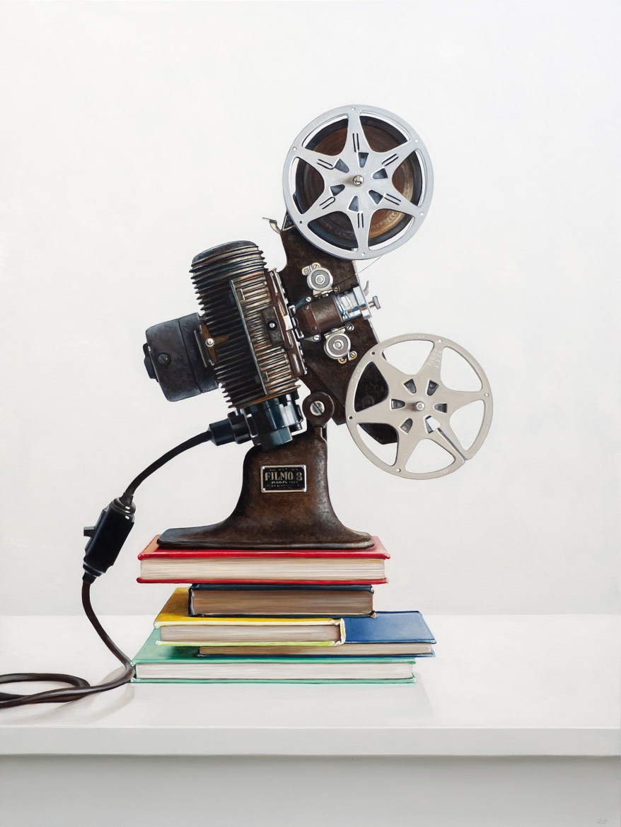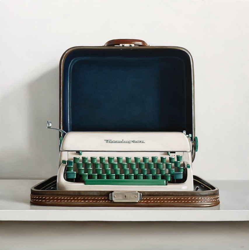 Christopher writes: “I approach my work with a naturalistic styling and a strong sense of minimalism and order. I paint a wide variety of vintage and antique objects including typewriters, books, clocks, bubble gum machines and telephones among other common technology and appliances. As subjects, they have built-in narrative, they tell stories. And transforming them to painting creates an intimate, slower viewing experience. My hope is that in the paintings a viewer can find big picture ideas and even personal histories and stories. The straight forward compositions break the objects down to simple shapes and designs. My painting technique, adding multiple layers of paint and minute but still painterly detail, creates a near-photorealist aesthetic. I choose to paint the objects because, put simply, painting is transformative.”