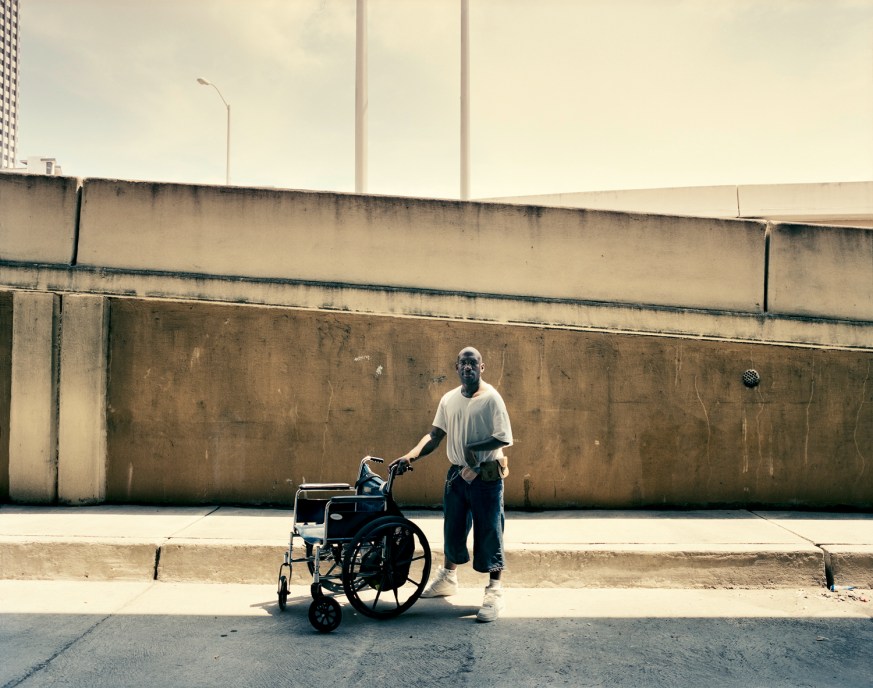 Kelly Mitchell and Ronald Major wait for free food handed out by a group of volunteers on weekends under the Claiborne Avenue Bridge. The number of homeless in New Orleans has more than doubled since Hurricane Katrina, which is not only due to the lack of affordable housing, but also to family safety nets having disintegrated. On top of this, nearly 80 percent of the homeless suffer from disabilities, which is also about double the national rate. Major has a heavy limb and pushes a wheelchair. Since he lost his home in the Hurricane, he lives under a bridge, and tries to keep hope alive as he says.