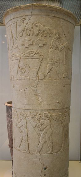 This remarkable alabaster vase, just over one metre tall, is carved in shallow relief with a series of encircling registers. The imagery can be understood as a representation of cosmic order which, from bottom to top, ascends from water that sustains cultivated plants and domesticated animals, through a procession of naked (and thus pure or subservient) men carrying vessels loaded with produce, and culminating in the uppermost register where the priest-king makes a presentation, with the help of an intermediary, to a female. She stands, raising her clenched fist, before poles with loop and streamers. These poles are symbols associated with Inana, the patron goddess of Uruk. This is thus one of the earliest narrative images intended to show an unending presentation from humans to the gods.
