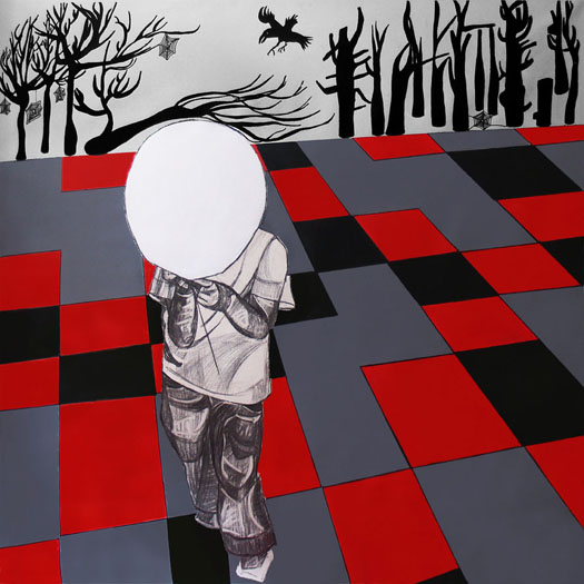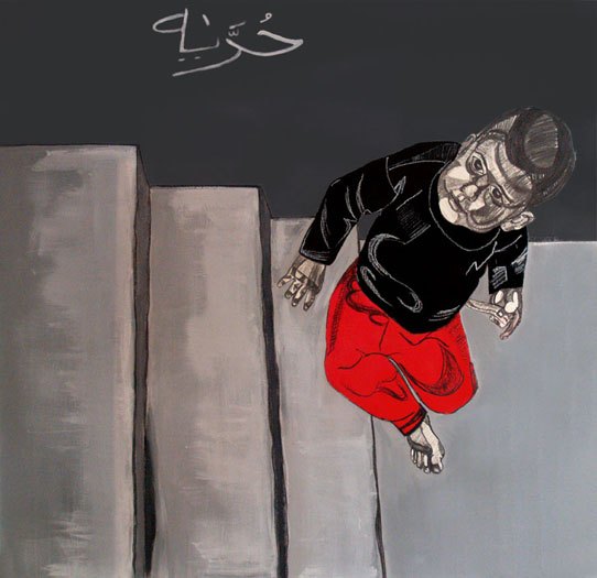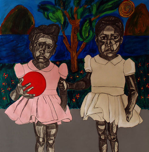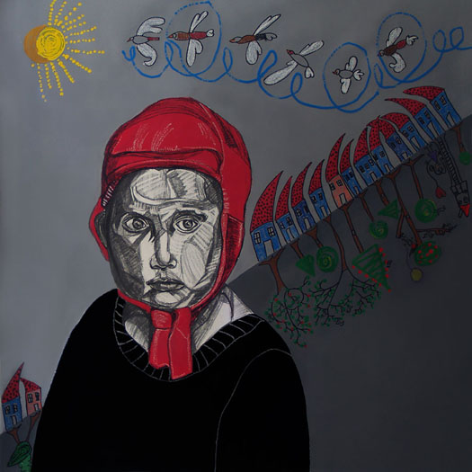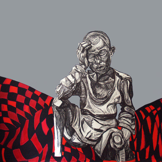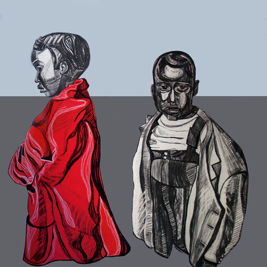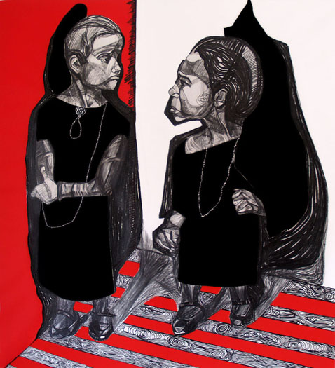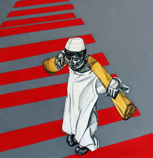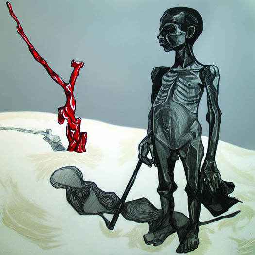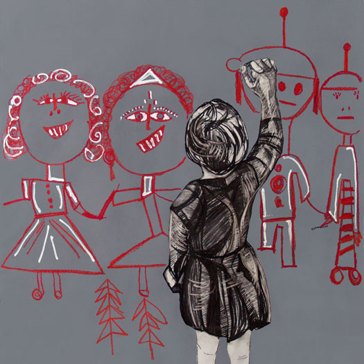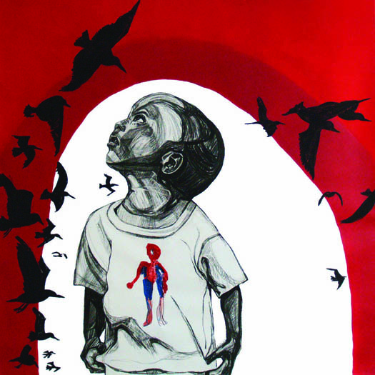 The artist writes: “I chose a monochromatic palette based on tonality in order to express the fragile relationships that are developed when the environment becomes constricting for the children themselves. In order to reach to some aesthetic result and to realise the grey, I saw the studies of Mondrian, Giacometti and Jasper Jones on that colour; although exceptional works with grey compositions exist in Western Art since the Middle Ages. The red in my work complements or composes the hope for uplifting and sometimes the risk posed by the apathy and indifference towards children and the difficulties encountered.”