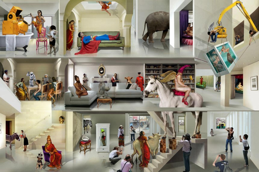 By Manjunath Kamath. The artist writes: “Through my works I attempt to bridge the gap between cultures, questioning their hegemony and the need to build walls for preserving and isolating one’s culture. At times, advocating for humor, absurdity and nonsensical behavior in daily life as the only response to the dilemmas of the conflict ridden world. The images are often informed by historical and classical cultural iconographies, which are a byproduct of beliefs and rituals. I am particularly interested in studying the gradual evolution/changes in the iconographies both traditional and contemporary, according to time and diverse influences.I create images which are an amalgamation of different cultures and faiths, yet not belonging to any one in particular, in an attempt to subvert them and free them from their historical purpose. Questioning the authenticity of history as what we perceive as history is most often an incomplete narrative, recorded by the victorious or the ones in power at the given point in time, so is history in reality not fiction?”
