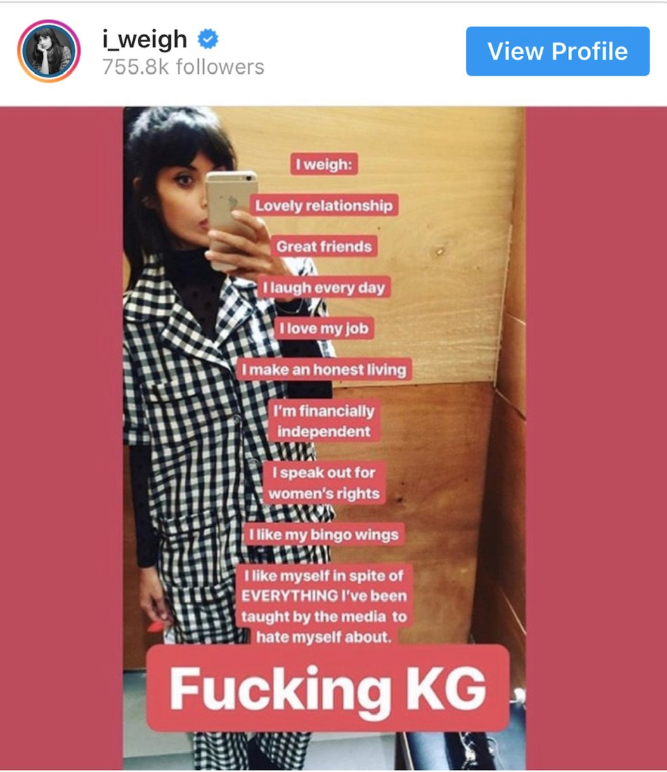 - Activist, Actress and Founder of I Weigh, Jameela Jamil started the @i_weigh Instagram account in March 2018 in a response to the way that women are valued in popular culture. She encouraged people to weigh themselves through their accomplishments and values rather than their physical appearance. I Weigh is about radical inclusivity, so that no one feels alone. SUM OF YOU invites you to shed what does not serve you and wear your collective being with pride. It acknowledges that you are more than your reflection in a mirror, you are made up of your experiences, your relationships, your thoughts and values. Take a moment of reflection and radical self-acceptance. Write all the things that make you you on the mirror and share with #IWeigh to join a growing community shredding beauty ideals and building a path towards self care. What do you weigh?