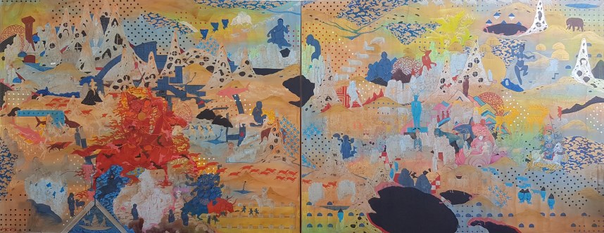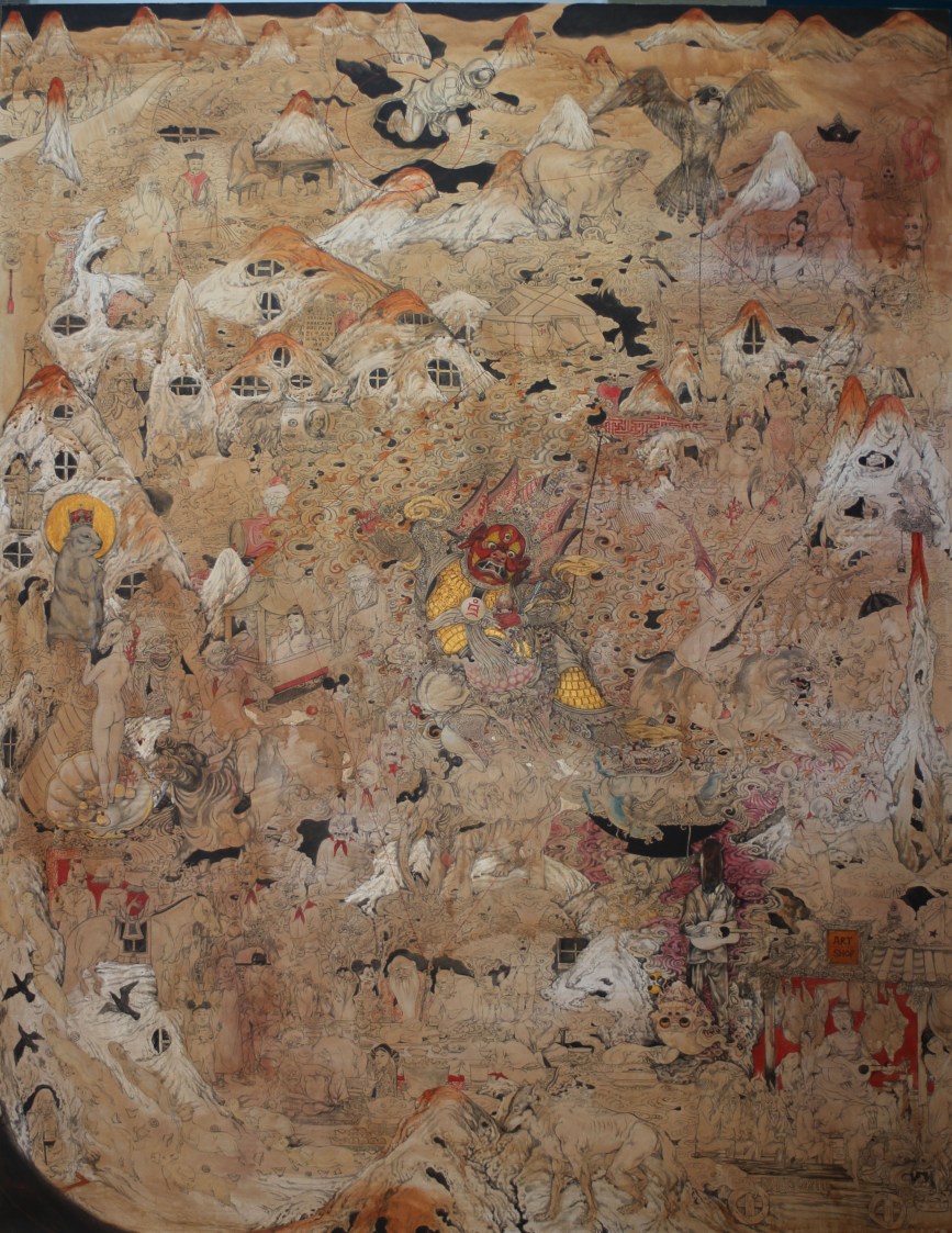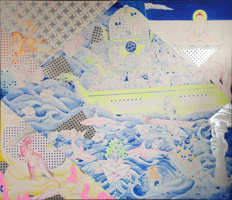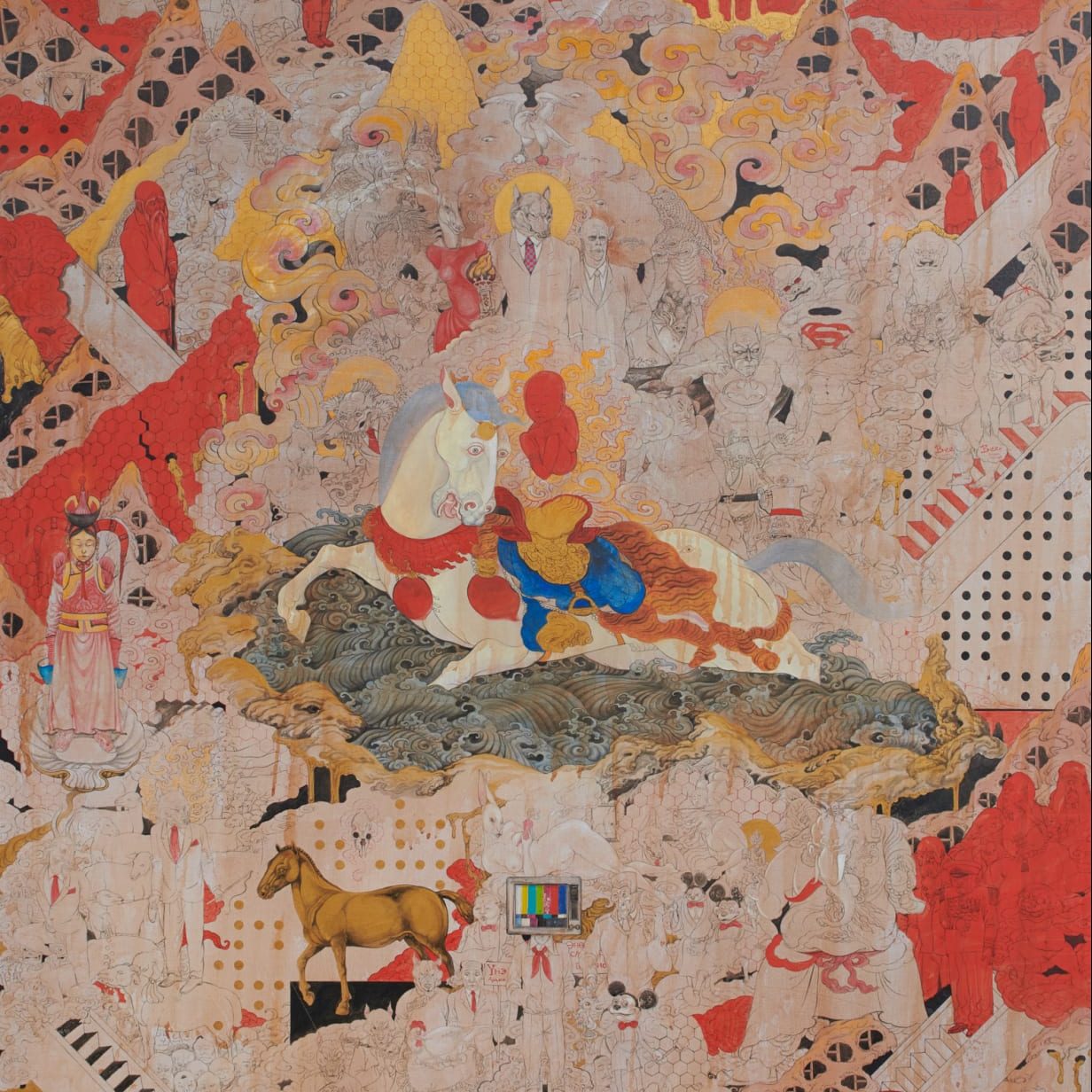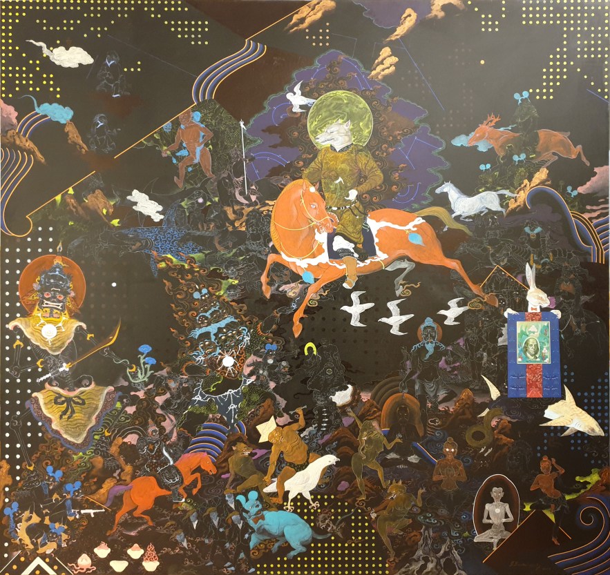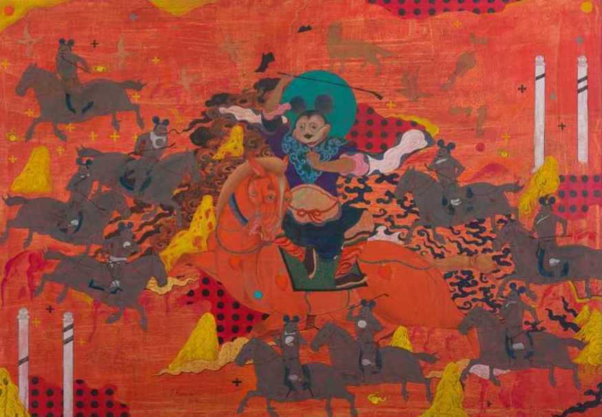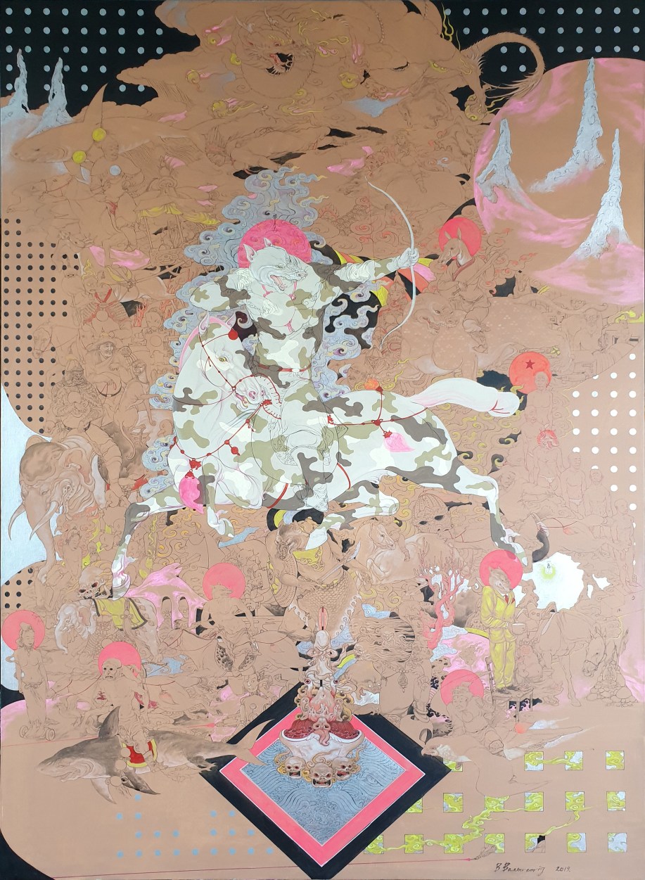 Drawing on the techniques of the Mongol Zurag painting—that first emerged during the Mongolian independence movement in the early 20th century—Baatarzorig Batjargal, examines the broader history of Mongolia over the past century in a fresh, innovative manner.