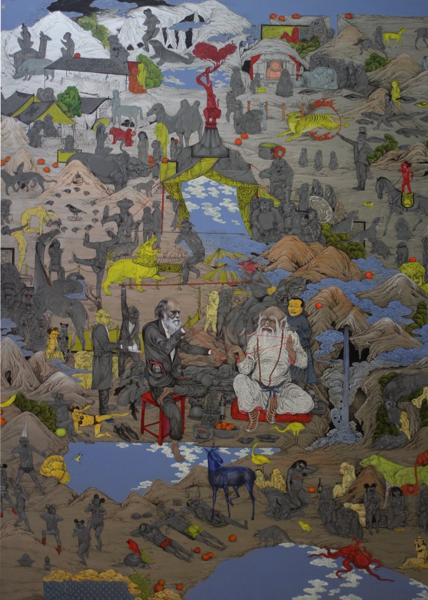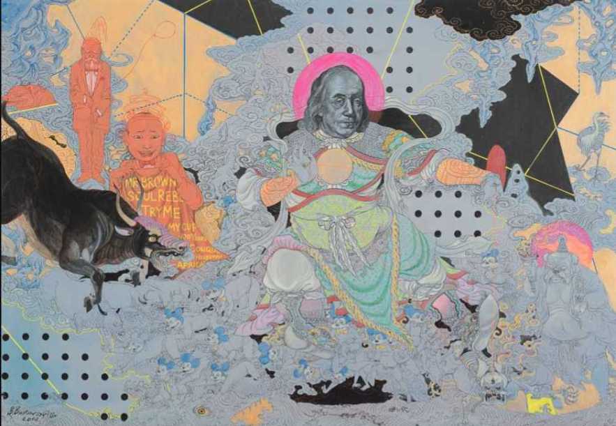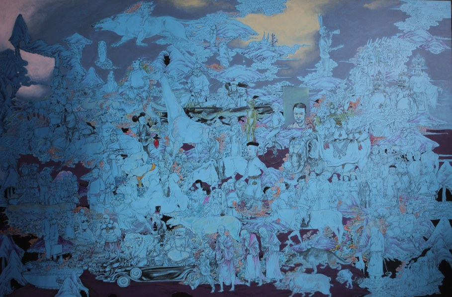 As he explores a time of unprecedented urbanisation, the artist addresses the contradictions of his own environment, providing, in the process, a multi-layered social commentary. He pans from the repressions of Soviet-style communism (dating back to the Stalinist purge of 1930s) to the inequalities and consumerism of global capitalism (post-1990s), and offers narratives concerned with the loss of traditional heritage. In a rich tapestry of various regimes, the portraits in his series include gods, holy men, artists, intellectuals, warriors, noblemen, politicians, oligarchs, even cartoon characters.