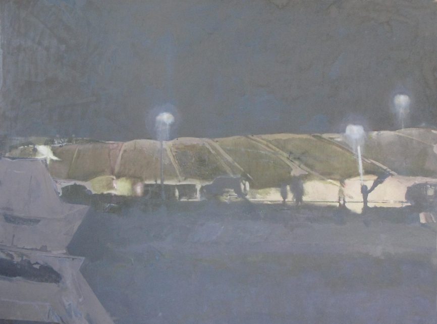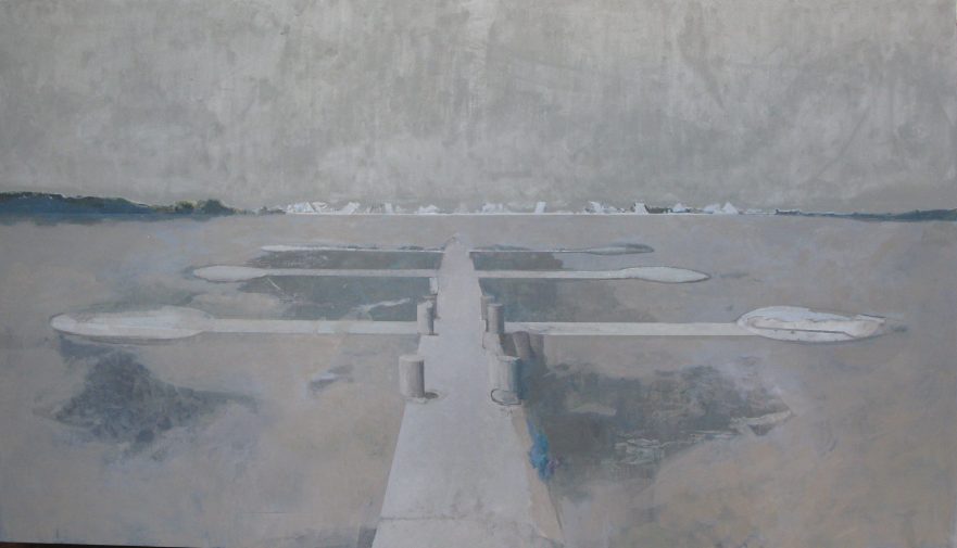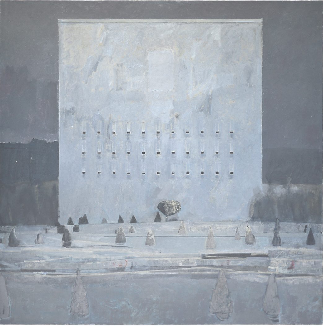 In his paintings, Hila employs a limited yet deep palette of greys and blues and shows a society under the force of profound changes. Suspended between eras and ideologies is ghostly architecture—boulevards and buildings that rise from the mist and go back into it. The Albanian psychology is materialised in mysterious, haunting imagery that announces the end of a world but also signals the possibility of reinvention, a search for a better, fuller identity.