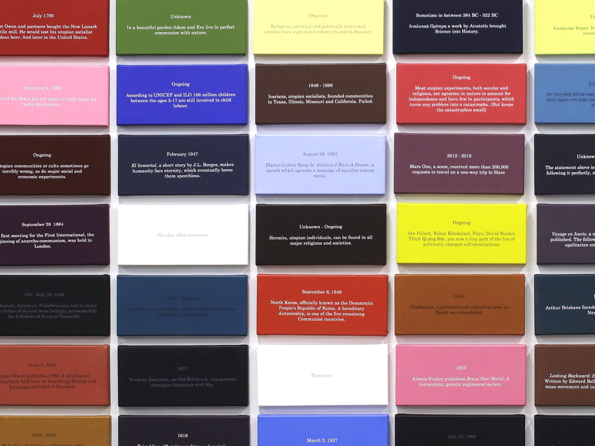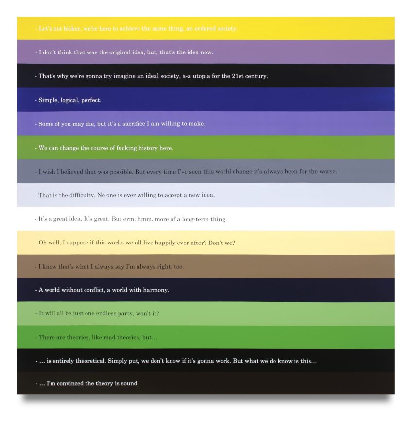 The artist’s research about utopias is woven together with sentences and ideas drawn from communities in the United States and California, spiritual or religious beliefs, ideas about the afterlife, literature, law, politics and cinema. The speculative nature of the work’s textual dimensions also appeal to mythological beings and a specific, unrealised utopic community in the artist’s mind that he refers to as “Thistopia”.