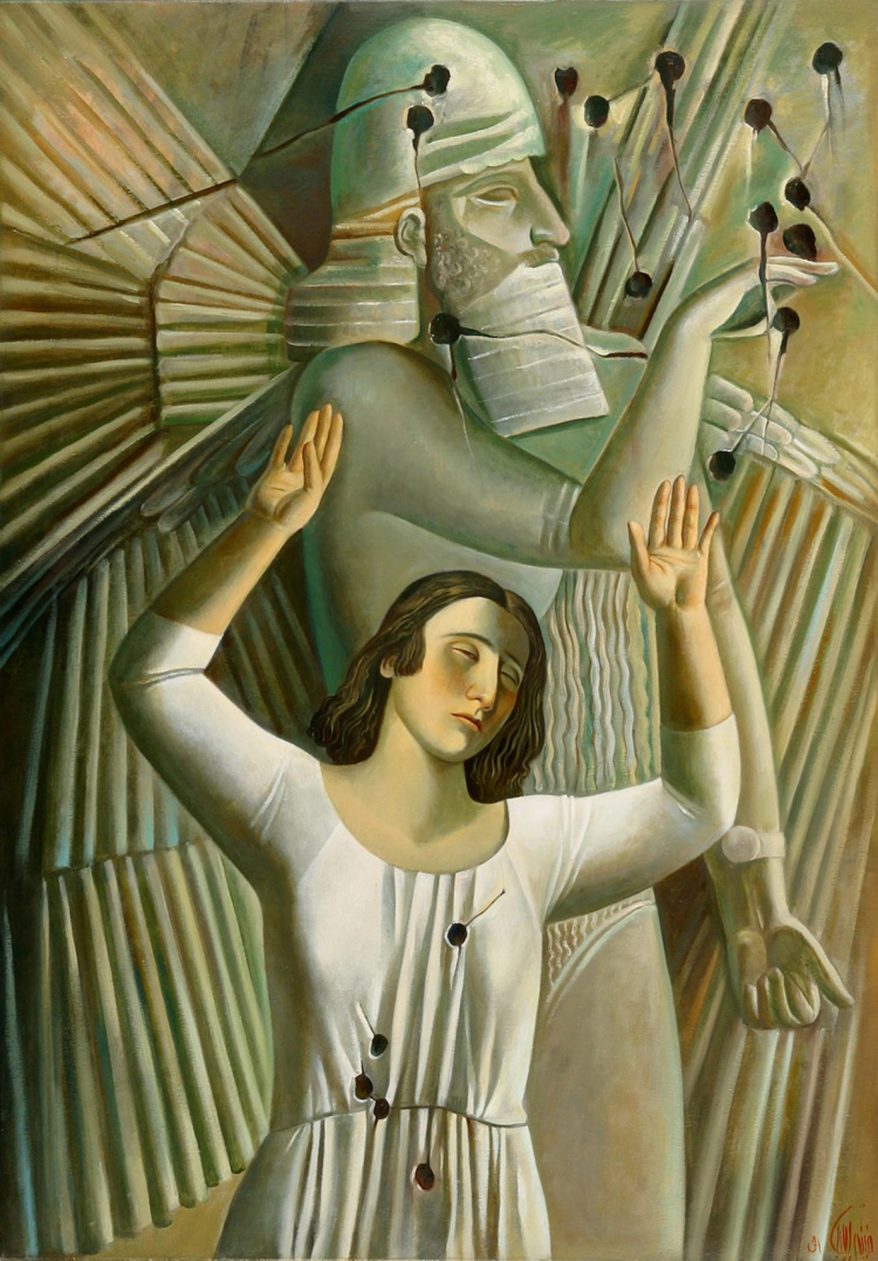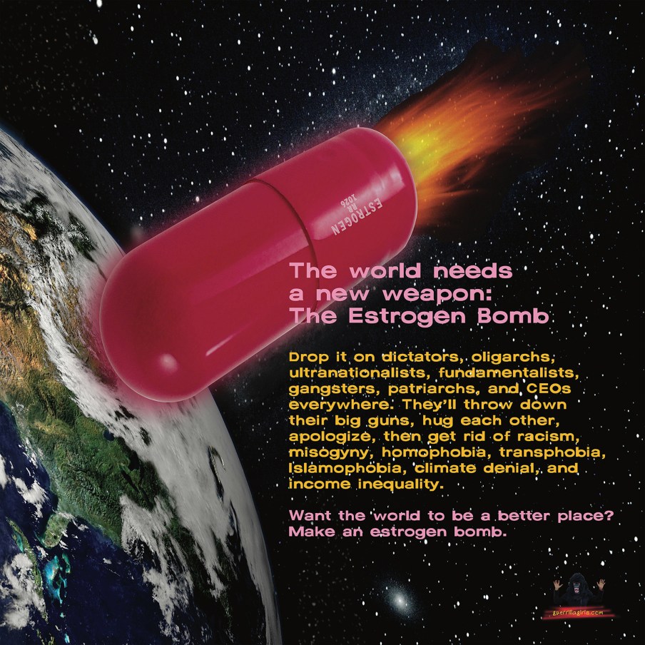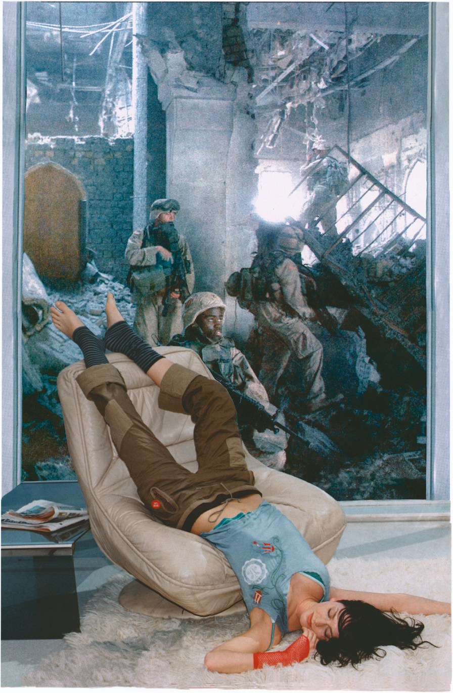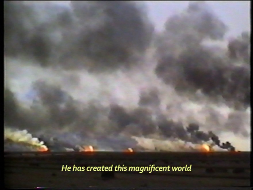 By using ancient Mesopotamian imagery, Afifa Aleiby brings into focus the attack on culture and civilisation, Jamal Penjweny exposes the ubiquitous terror felt at the name of Saddam, Guerrilla Girls question the efficacy of male leadership and issue a fiery call to drop the “estrogen bomb” on dictators and CEOs, Martha Rosler expresses the general indifference and ignorance of affluent Americans. Monira Al Qadiri creates a disturbing and ironic presentation by situating a theological idea (“He has created this magnificent world”) against a field of fire and heavy smoke, while others poignantly show the destruction felt at the level of city streets and concrete, particular human lives.