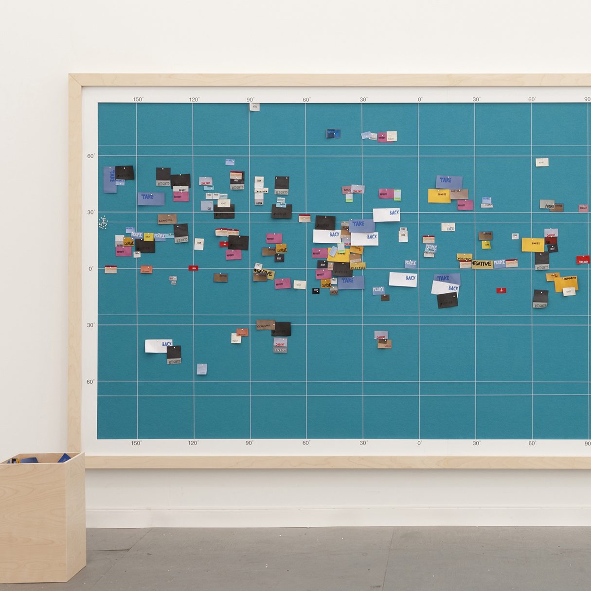 Brazilian artist Rivane Neuenschwander explores the semantics of rage and dissension. Her Watchword is a large-scale interactive work that contemplates proclamations personal or public. Here viewers are invited to engage with an abstracted version of the world map using words and phrases provided by the artist. The word “Back” is particularly evident, a common ingredient of protest slogans. It could indicate a yearning for reversal (given the damage we’ve done to the environment) or our obsessive territoriality (strange, considering the fact that national borders exist not objectively on earth but only in our minds).