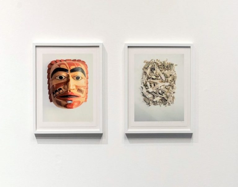 In Kill the Indian, Save the Man, Galanin splinters a mask in what appears to be a destructive gesture. However, this act is not directed at the cultural production of Tlingit people, the materials are masks made by Indonesians for predominantly non-Indigenous markets. The exclusion of Tlingit people as participants in either the creation or collection of these objects is terminated. As Galanin intercedes, he dismantles the masks and forms a new mask from the resulting wood chips, thereby taking back agency through this new creation. This narrative is further segmented by the title that references the traumatic imprisonment of Indigenous children. In 1879, the United States opened the Carlisle Indian Industrial School under Pratt’s coined slogan, “Kill the Indian, Save the Man.” Indigenous children were taken from their families and subjected to forced assimilation program that included corporal punishment for speaking Indigenous language or practicing cultural rites.