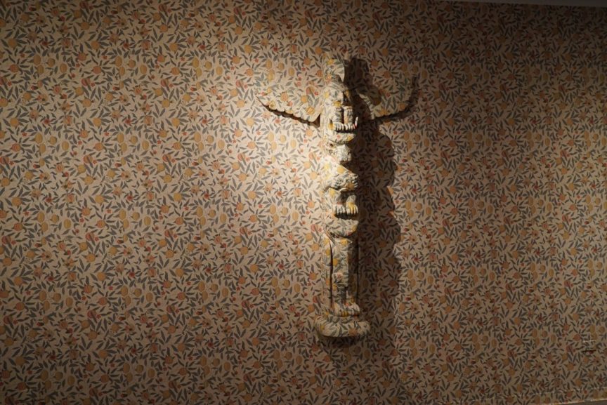 In The Imaginary Indian (Totem Pole), Galanin juxtaposes the form of a carved totem overlaid with Victorian Era floral designs. He both confronts viewers with their own assumptions about Indigenous art and reflects on the attempted assimilation of Indigenous culture by Europeans, thereby asserting contemporary Tlingit art as continually evolving. As he says, “This is despite the resistance of individuals and institutions that would limit Indigenous culture based on assumptions about Indigenous peoples prior to interaction with Europeans. The fetishization of early contact and pre-contact Tlingit art has resulted in skeletal, ghost-like objects in gallery and museum collections. The Imaginary Indian series points to the romanticization of these works as a form of colonization of culture, dependent on devaluing current cultural artistic production. The works reflect the attempt to disappear the Indigenous into the European through hand painting the surface of the pole to match the Victorian era floral wallpaper.”