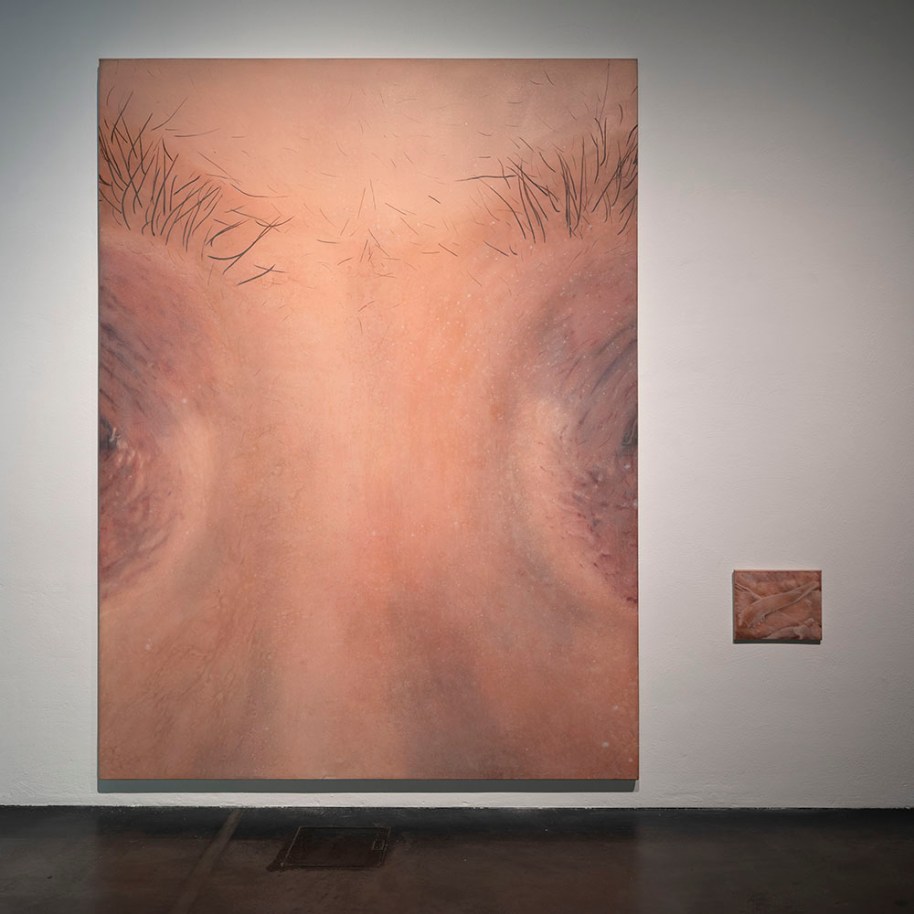 The large canvas shows a close-up of a human face. The smaller painting portrays a demodex, a microscopic mite that lives in the follicles of human eyebrows and eyelashes. The two paintings form a diptych. The artist Alma Heikkilä reflects on how all organisms are dependent on one another. The diptych makes visible something that normally goes unnoticed in our daily lives: we exist in a state of symbiosis with billions of microbes, bacteria and organisms. These invisible microscopic beings are critical to our health and wellbeing.