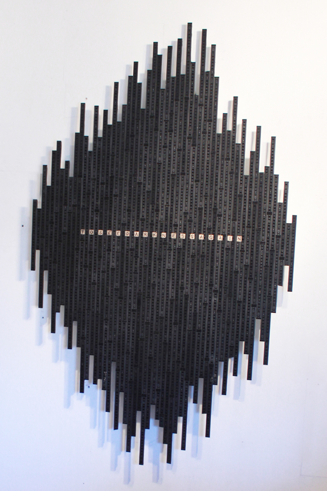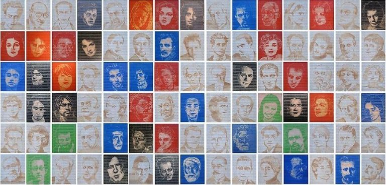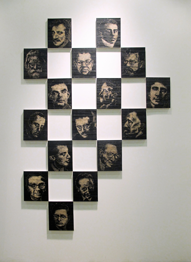 The title of the show was inspired by philosopher Gilles Deleuze, who once said that “Colours appear in space and time but in themselves they are neither space nor time.” One wall-piece consisted of 100 bas-relief portraits of visual and performing artists who have committed suicide, colour-coded according to occupation, and created by scraping, sanding and burning rulers. But can any such endeavour of categorisation and computation fully conquer the mystery of life and death, genius and madness?